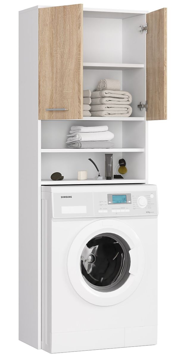 It is primarily intended for indoor use. On the upper shelves, you can store various bathroom accessories or towels, for example. Since the cabinets are located relatively high, they are a suitable place for storing chemical products that should not be easily accessible to children or pets. The shelf has two open shelves, which are a suitable place for items you need to have on hand. At the very bottom of the shelf is a space for a washing machine, forming a compact unit. Therefore, this shelf is ideal for the bathroom and laundry room.