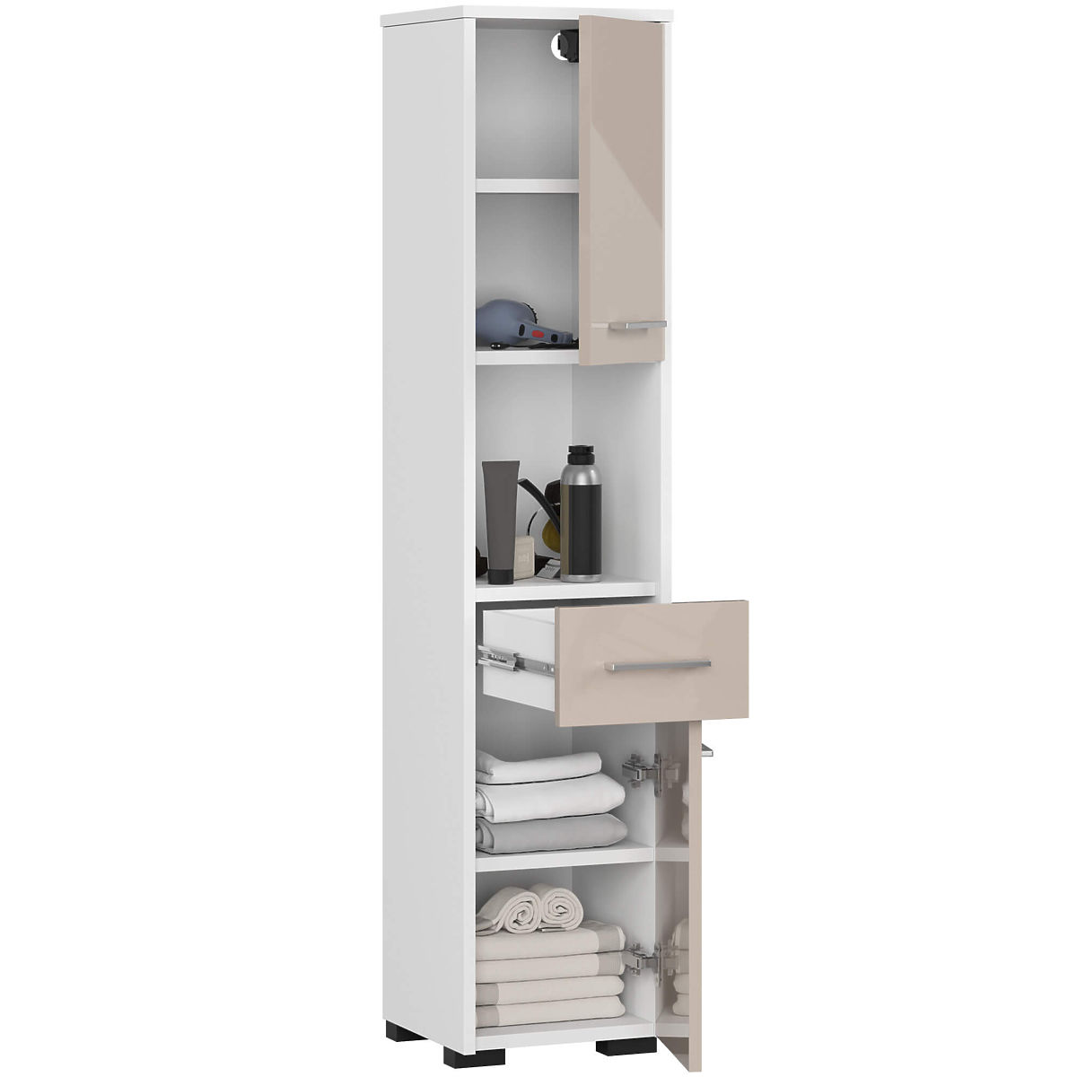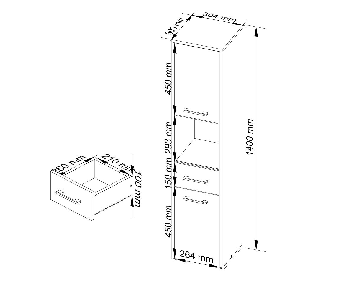 Shelves are highly functional furniture that can be used in various rooms. They can be successfully placed in the bathroom. The FIN bathroom column shelf 2D 1SZ 1W is made of high-quality 16 mm laminated board from Kronospan, with ABS edging on the edges. This makes the cabinet highly resistant to moisture, abrasion, and mechanical damage. At the bottom and top of the shelf, there is a cabinet with doors, divided by a shelf. Towels, bed linen, or cleaning agents can be stored in them. The middle part of the column features a pull-out drawer, an ideal place for small cosmetics. Above the drawer is a spacious open area that can be used to store larger cosmetics. The doors of the shelf are adorned with silver handles.