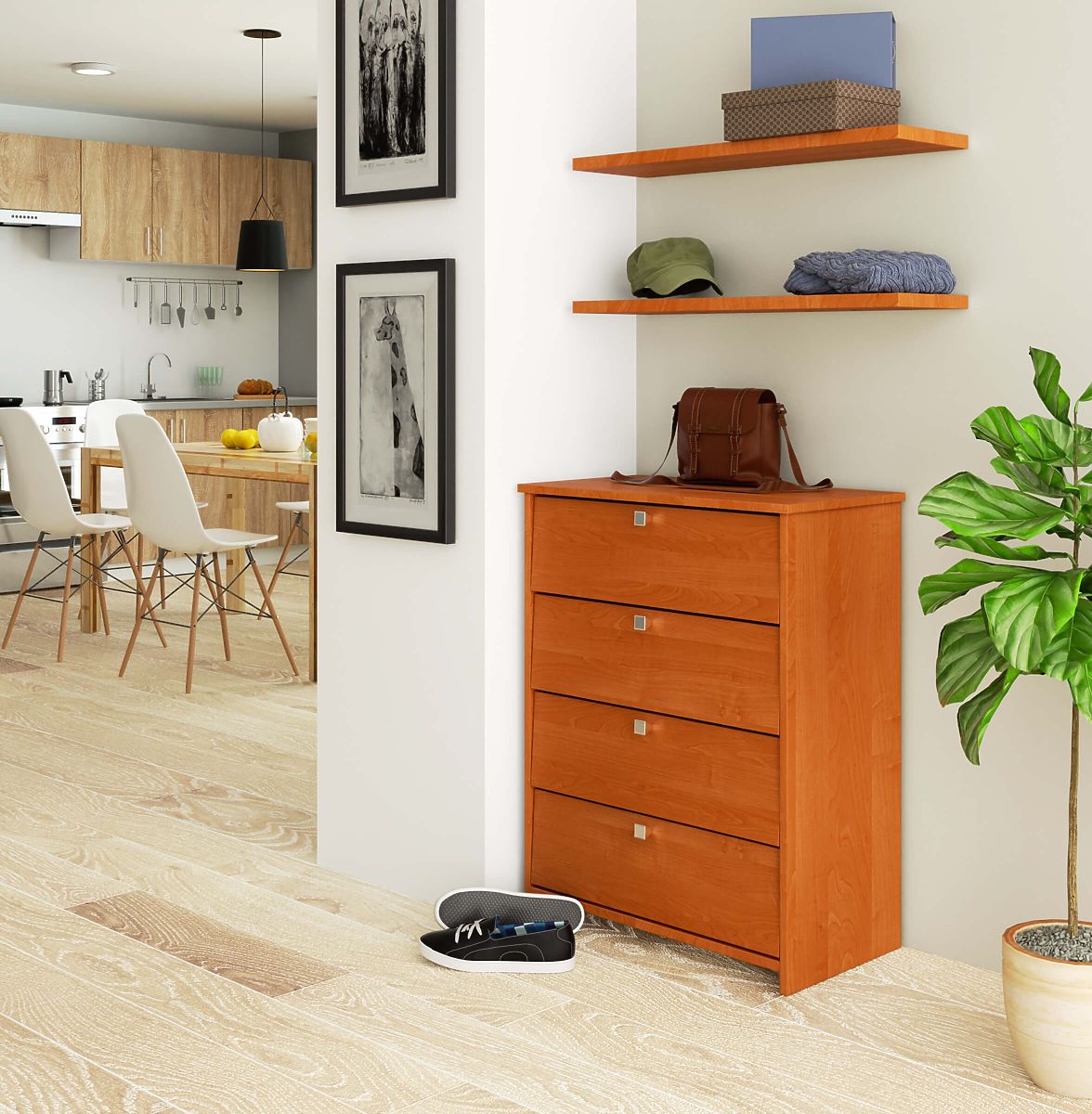 The shoe cabinet in ruby alder color is both aesthetic and functional. The furniture is suitable for both large and small hallways. The shoe cabinet has four spacious shelves with flip doors and satin-finish handles. It can accommodate shoes of all sizes and shoe cleaning accessories. Equipping the hallway with this shoe cabinet makes it easier to maintain order. The furniture looks so effective that it fits even the most elegant hallway interior, regardless of the style in which the room is decorated. The color of the furniture is universal, so the shoe cabinet will look good even when combined with a coat rack or wardrobe in a different shade. The shoe cabinet is made from laminated board, which is highly resistant to abrasion and mechanical damage. The edges of the furniture are finished with an aesthetic and durable ABS edge. The shoe cabinet can be wiped with a damp cloth, which makes it easy to keep the furniture impeccably clean.