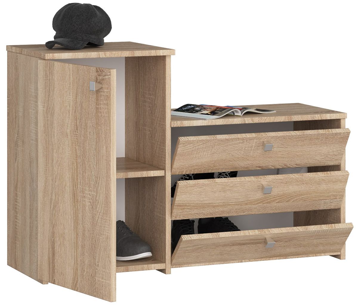 This is a high-quality standing shoe cabinet in Sonoma oak color. It is made from high-quality Kronospan laminated board with ABS edges that protect the furniture from damage. The board thickness is 16 mm. Additionally, the shoe cabinet is combined with a dresser equipped with doors, which has one shelf inside. This significantly enhances the functionality of the shoe cabinet and allows for additional shoes or other necessary accessories to be placed in the dresser. The S16 Sonoma oak shoe cabinet can be placed in the hallway, wardrobe, entryway, or staircase. Dimensions of the S16 Sonoma oak shoe cabinet: length - 98.4 cm; height - 68 cm (dresser), 43 cm (shoe cabinet); depth - 33 cm. Door handles are cuboid-shaped, in silver color. Shoe cabinet intended for self-assembly. All elements needed for assembly are included in the set.