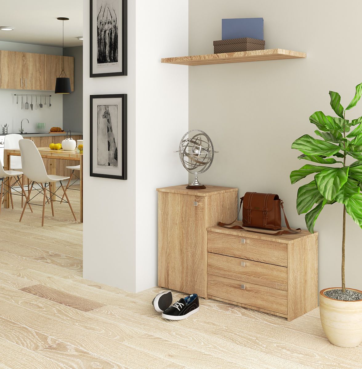 FURNITURE SET FOR THE HALLWAY The shoe cabinet combined with a dresser ensures functionality and space saving.- Shoe cabinet made of abrasion-resistant laminated board