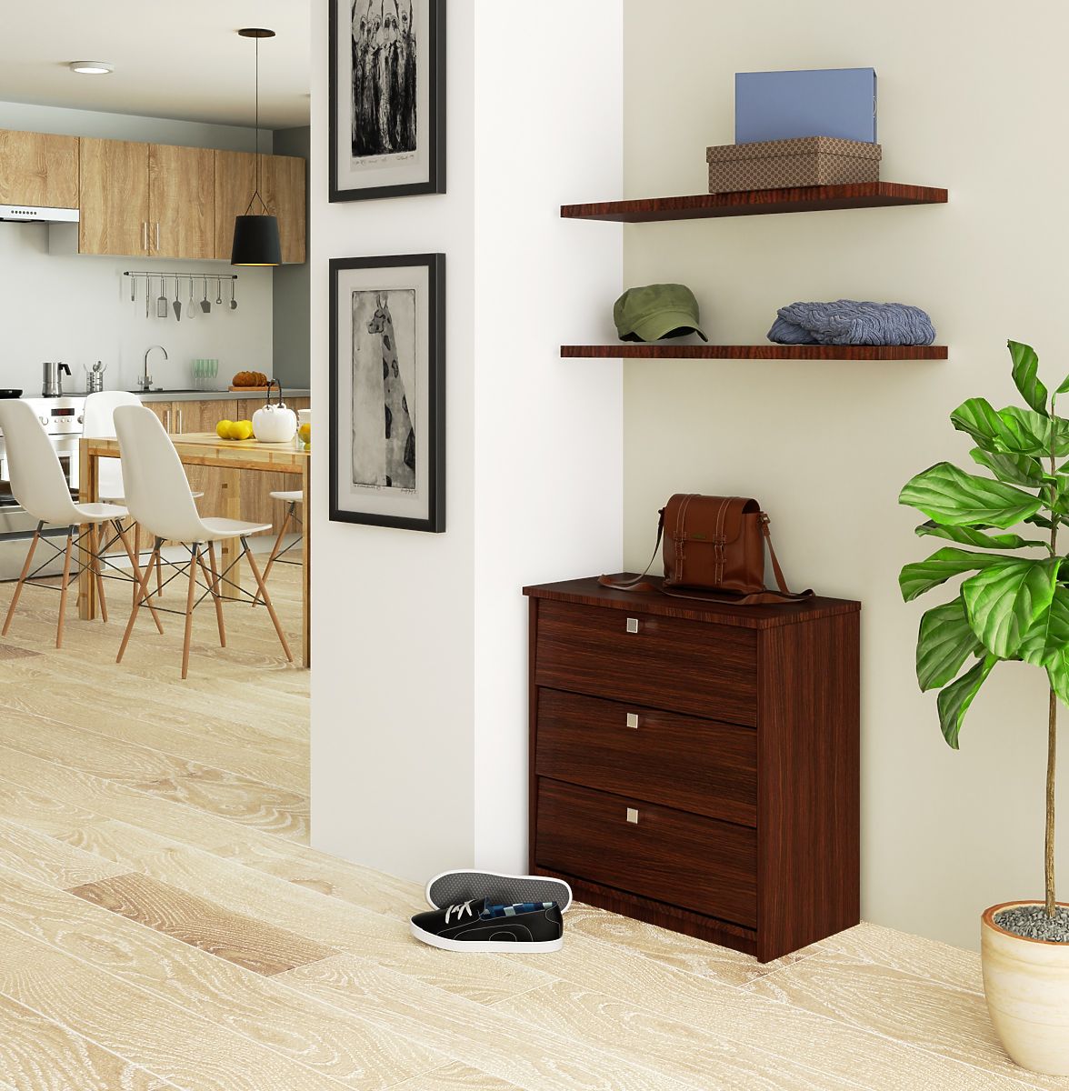 Compact wenge shoe cabinet with 3 flip doors and 3 shelves. .. more