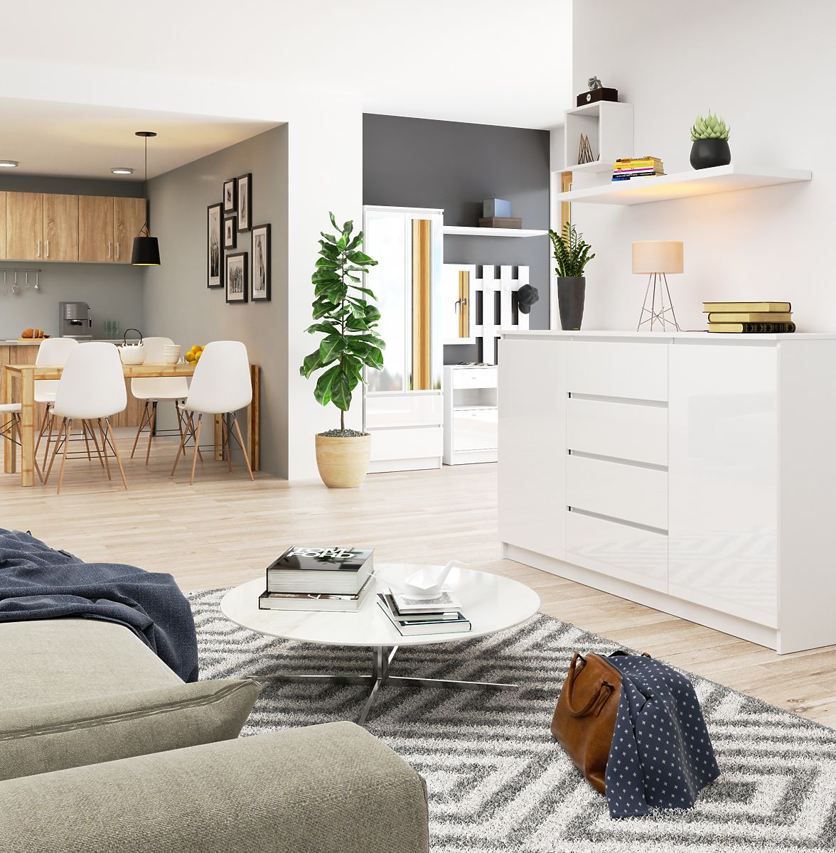 The body of the sideboard is made of 16mm white semi-matte laminated board, the fronts are made of 19mm ACRYLIC board with high gloss finish.