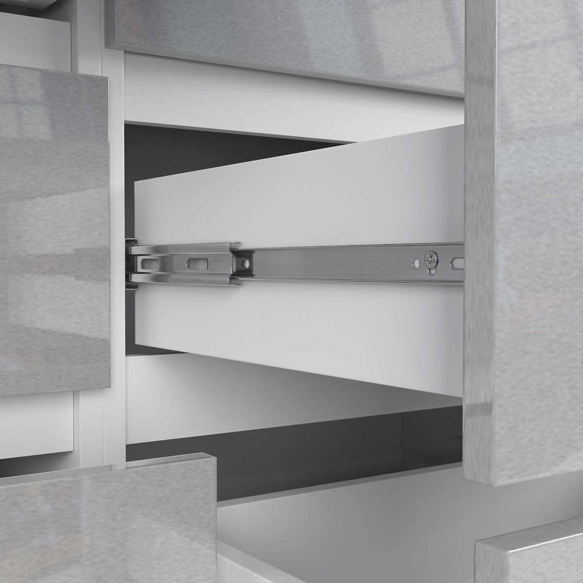 - Drawers move on metal ball-bearing slides