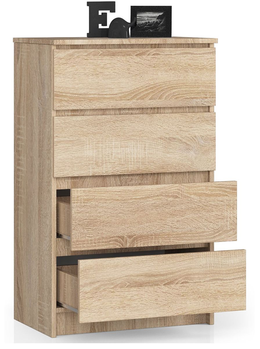 The small K60 chest of drawers is a design maintained in a fashionable, very popular color among customers. Of course, it is oak sonoma - a shade that fits perfectly into modern interiors, is very versatile, and combines wonderfully with all other colors. The chest of drawers itself is high-quality furniture equipped with four practical drawers. The design is intended for people who want to furnish their living room, bedroom, hallway, dining room, but also an office interior. High quality combined with a low price will surely convince customers who value simplicity and elegance in the best execution. You can match other furniture from the same collection to the chest of drawers, creating a dream arrangement of any chosen space.