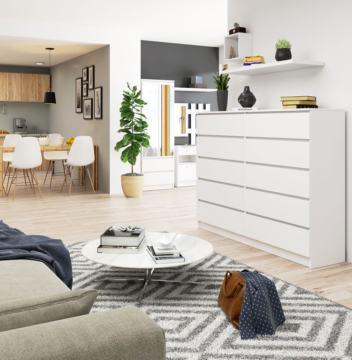 The chest is equipped with ten spacious drawers that can hold all necessary items. The universal and timeless white color allows you to combine the chest with various types of furniture in different color shades. The product is made from 16-millimeter thick abrasion-resistant laminated board. Edges are finished with ABS edging.