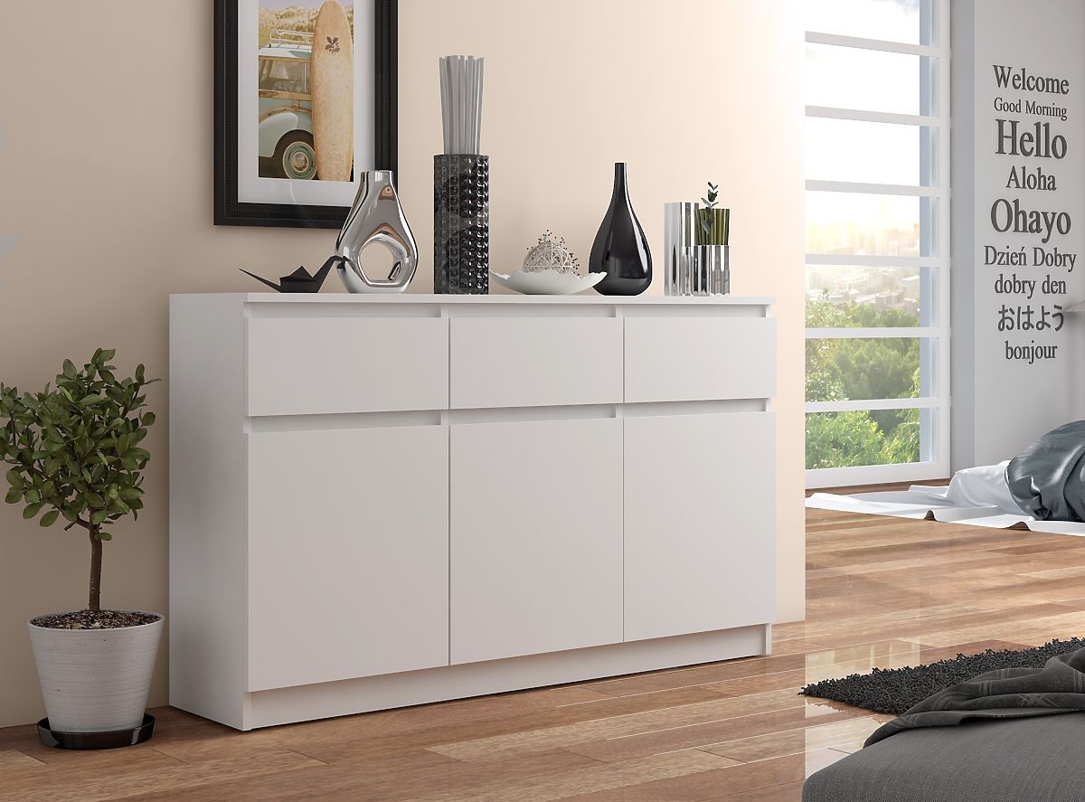 Introducing an exceptionally elegant chest of drawers, crafted from high-quality laminated board. It has a thickness of 16 mm and is abrasion-resistant. Sourced from the renowned manufacturer Kronospan, ensuring its durability. The chest features three drawers and three cabinets. The drawers glide on metal ball-bearing slides, ensuring smooth and easy opening and closing. Each cabinet has a spacious shelf accessible via doors. The furniture edges are finished with ABS edging, providing high protection against damage.