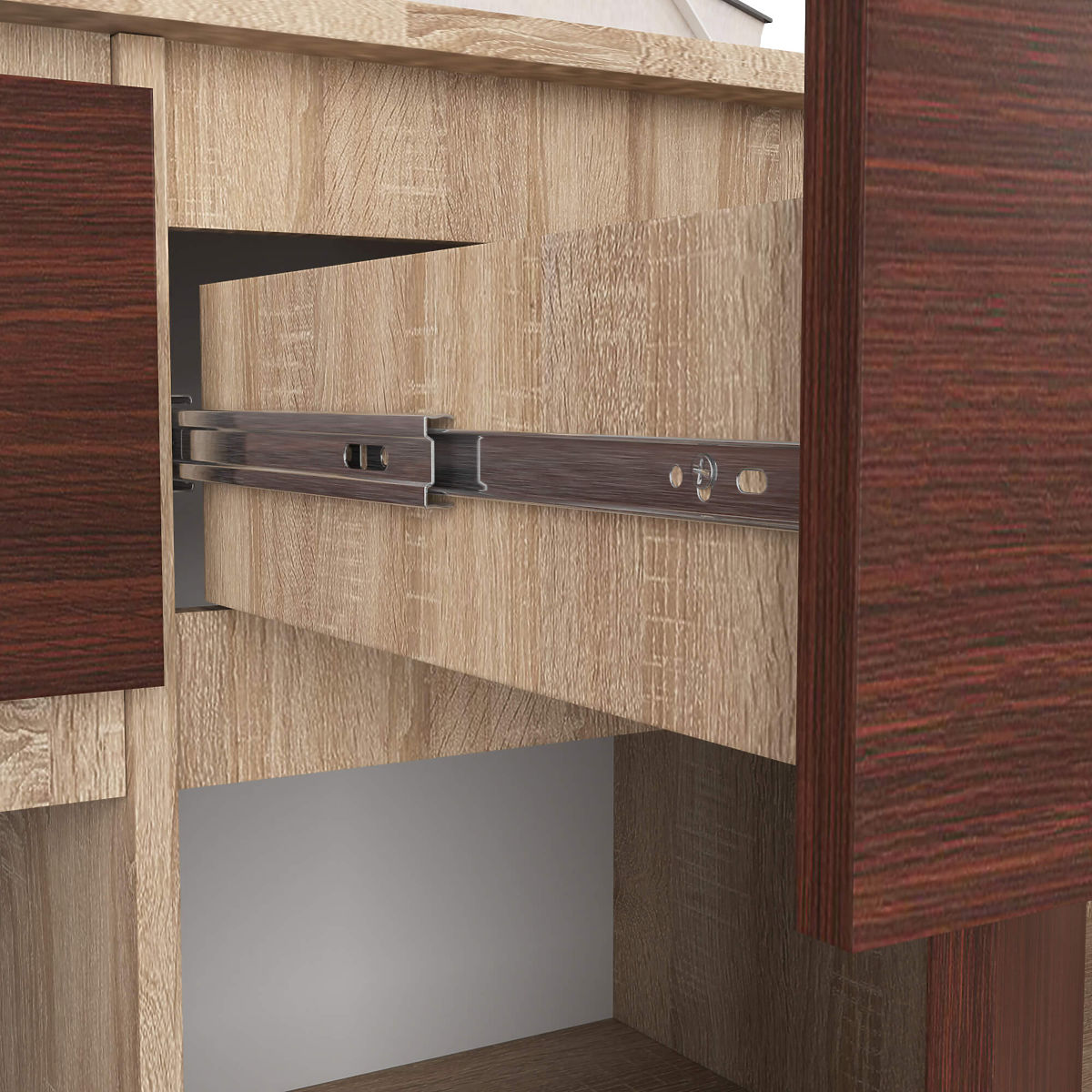 A large, very spacious and functional sideboard made of high-quality abrasion-resistant laminated board will surely present beautifully in any living room, as well as in other residential or office spaces. The furniture uses a durable board from the Kronospan brand with a thickness of 16 millimeters. The drawers move on metal rails, making the furniture easy to use in everyday life. The edges of the furniture are covered with ABS edging, providing protection against damage. The product is intended for self-assembly. The universal colors of wenge and sonoma combine perfectly to form a timeless whole. If you expect high quality, attractive design, and an affordable price from an ideal sideboard, this offer is just for you.
