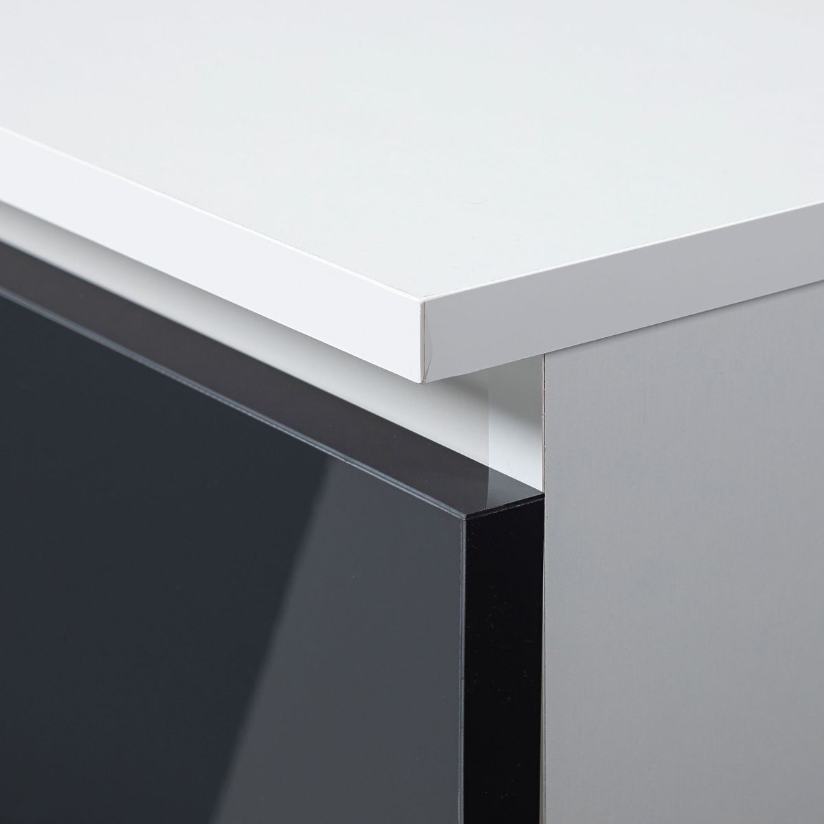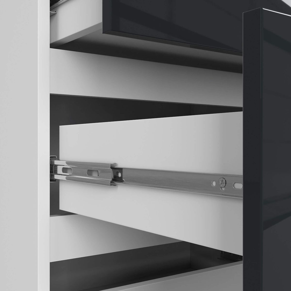 The K 120 cm chest of drawers features an unusual combination of colors. The furniture fronts are made in glossy graphite and combined with a white matte body. The matte and gloss is a very interesting solution and at the same time extremely versatile. Thanks to this, the style of the furniture fits into various arrangements, such as glamour and New York style, which appreciates shine and glossy surfaces, or minimalist and modern arrangements.