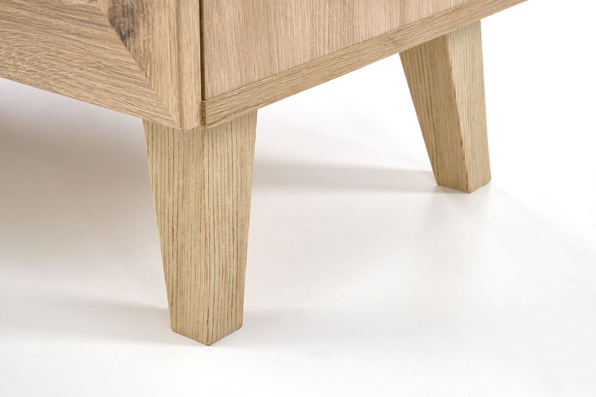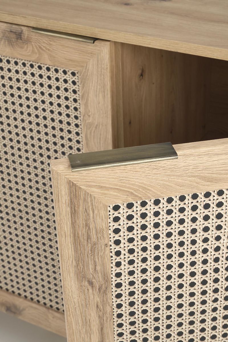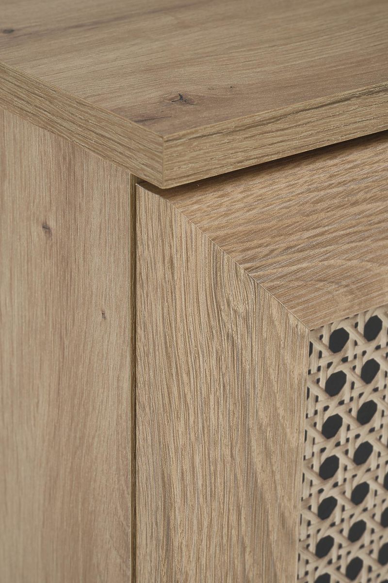 The oak artisan finish combined with trendy inserts in the Viennese braid pattern gives the sideboard a unique boho touch that immediately catches the eye.