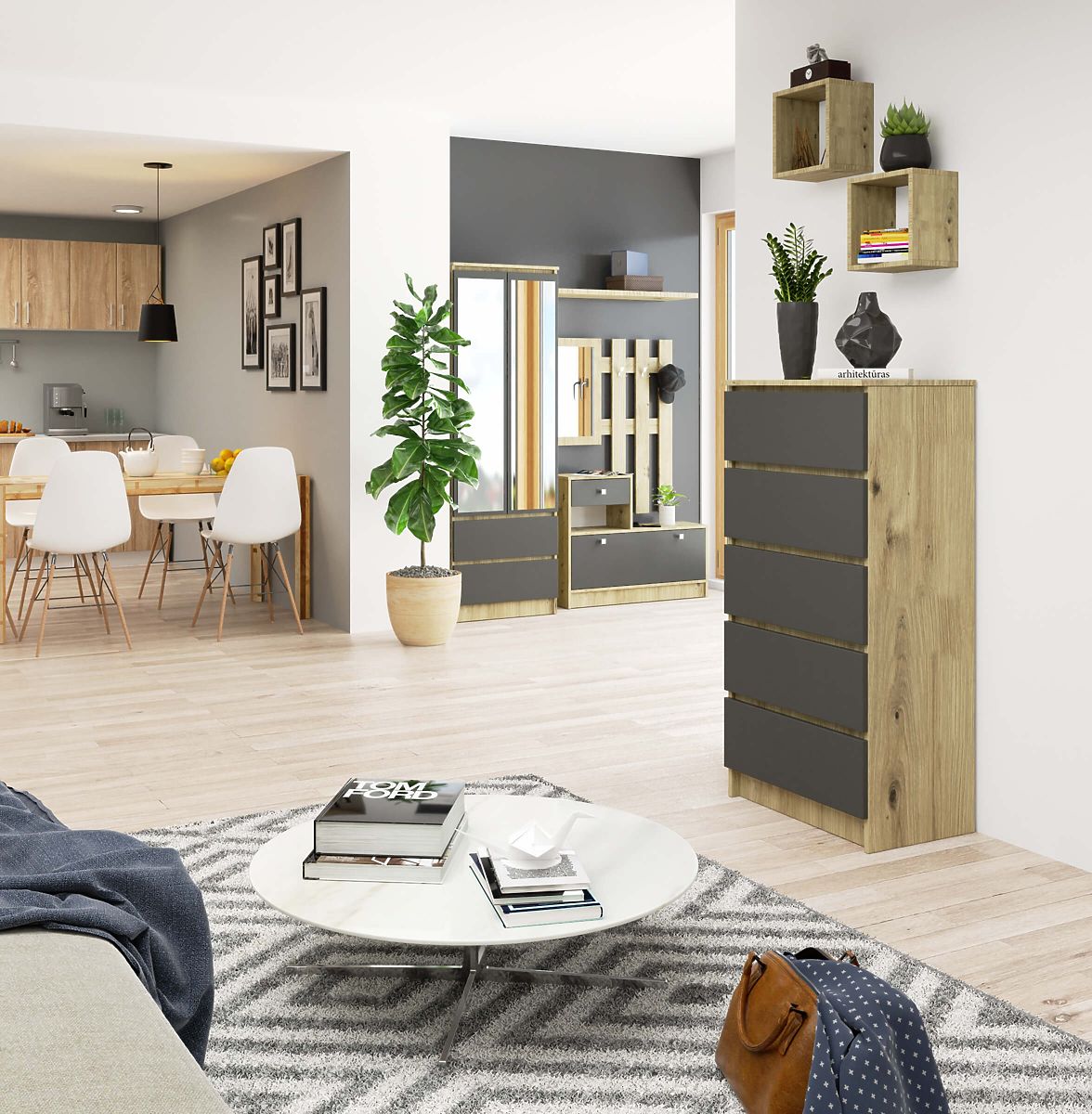 Five-drawer chest in Artisan Oak and Graphite Gray. .. more