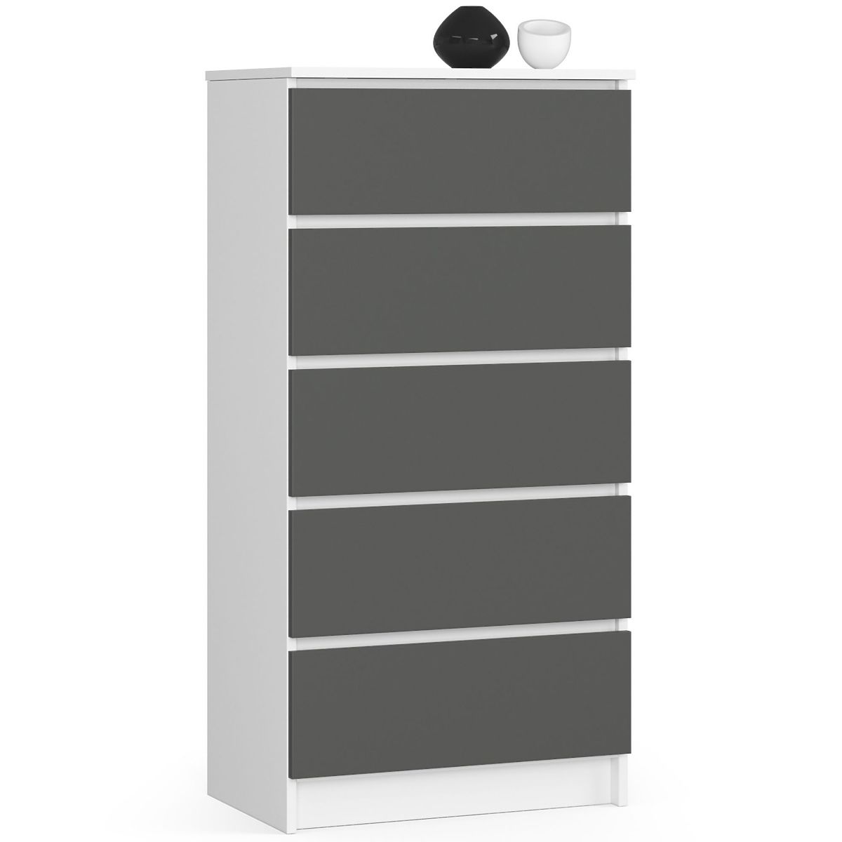 White and gray chest of drawers with 5 drawers and ABS edges. .. more