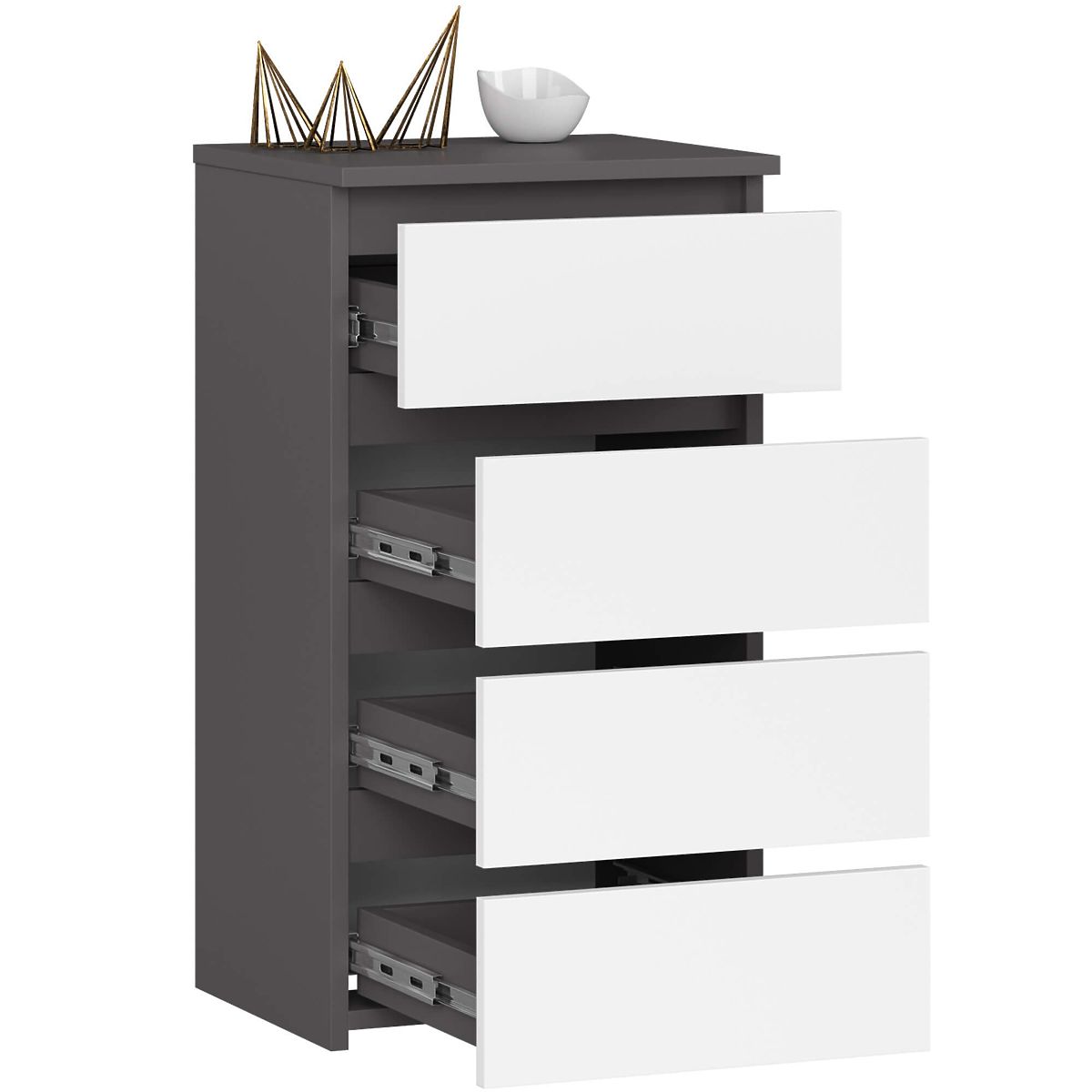 Dressers are a popular type of furniture placed next to the bed. A lamp is often found on its top, while inside are items that facilitate rest and sleep. Those looking for an elegant dresser should pay attention to the CL4 40 cm dresser in graphite gray with white fronts. It will look beautiful in any bedroom. It can also be placed in a child's room.
