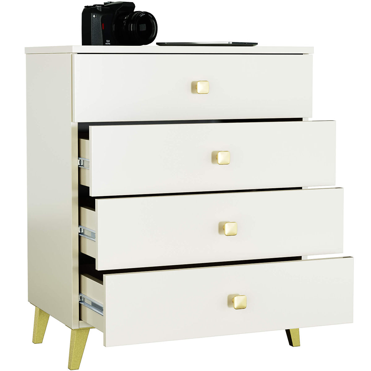 This small chest of drawers is a piece of furniture that will find its place in any room. Modern colors, solid construction, and careful craftsmanship have resulted in a cabinet that is perfect for a hallway, living room, youth room, or bedroom. It can also be used in an office space, where it allows for the storage of many documents and other office supplies. The chest consists of 4 drawers. The furniture combines cashmere and gold colors.