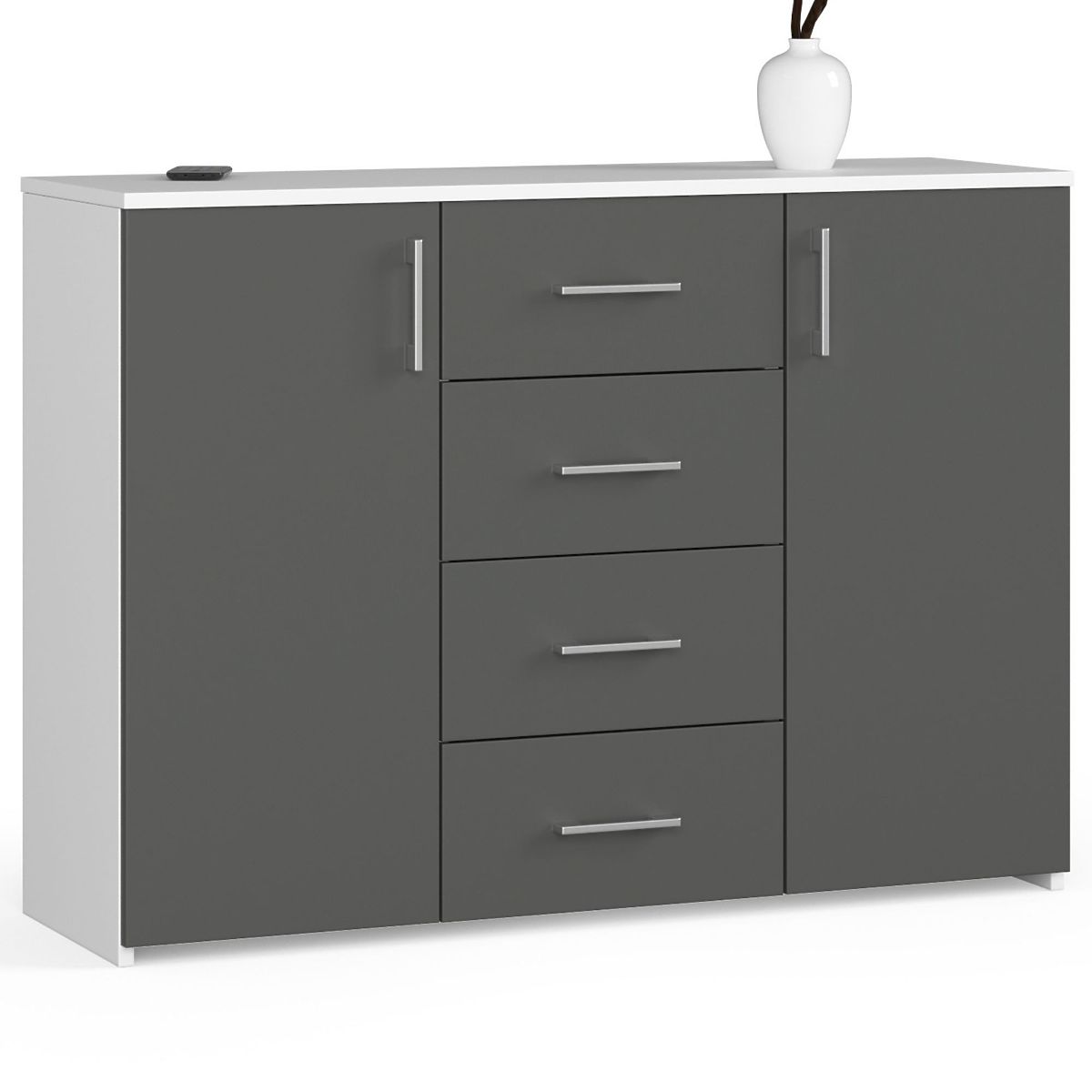 The white / graphite gray chest of drawers is a large and spacious piece of furniture with many functional features. On both sides of the chest are doors, behind which are 4 deep shelves. The center of the furniture is also very functionally designed, as it is equipped with 4 deep drawers. Therefore, the chest offers plenty of storage space.
