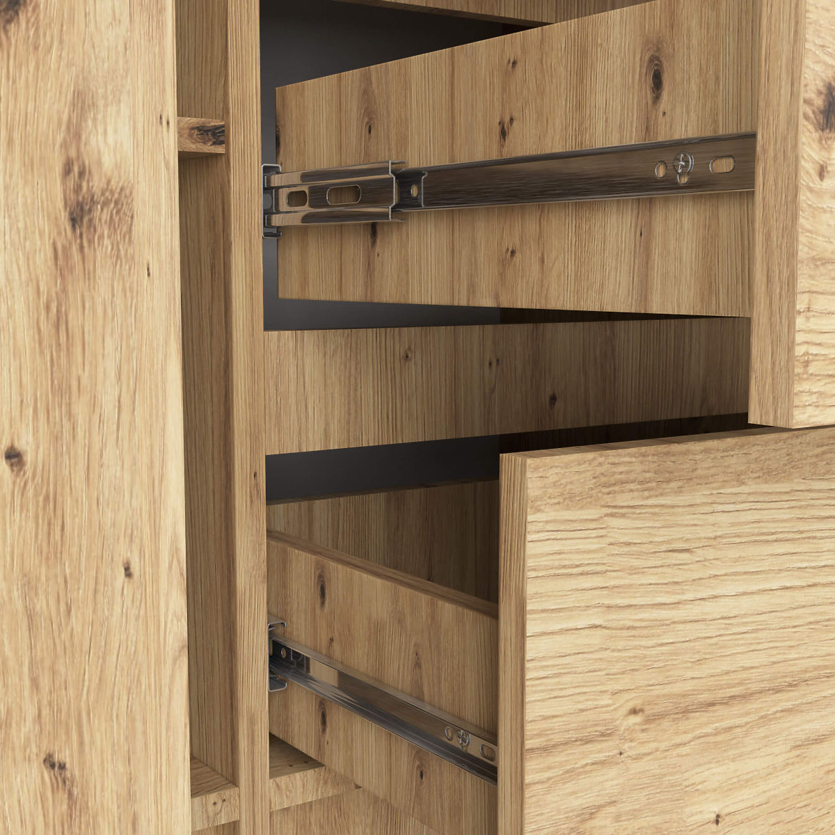 - Drawers move on metal ball-bearing slides