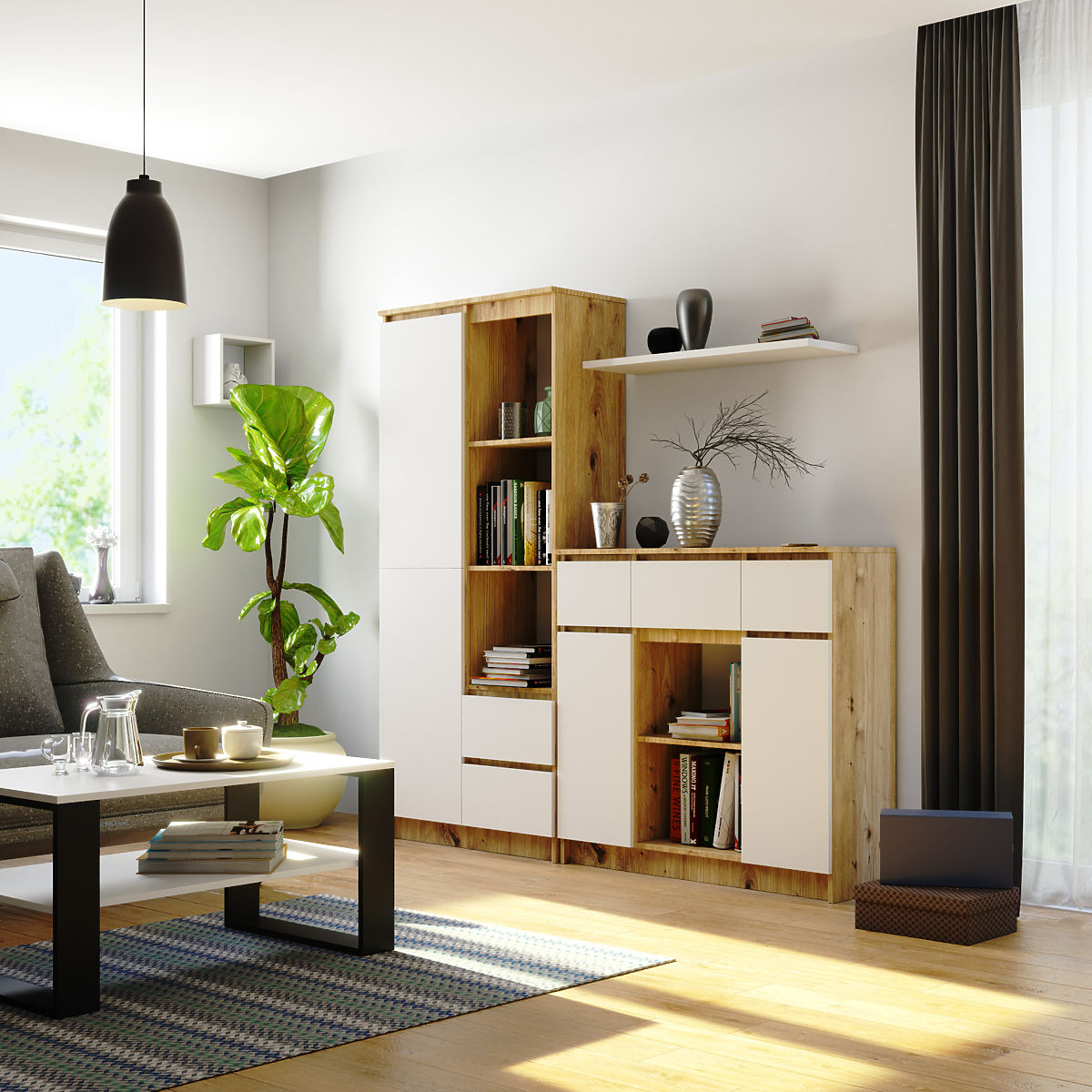 Sideboard with 3 drawers and 2 doors in Oak Artisan and White finish. .. more
