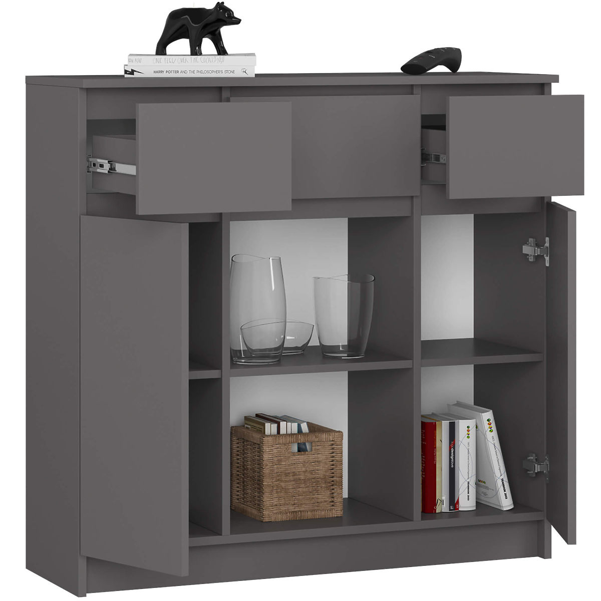 Graphite grey sideboard with 3 drawers and 2 doors. .. more