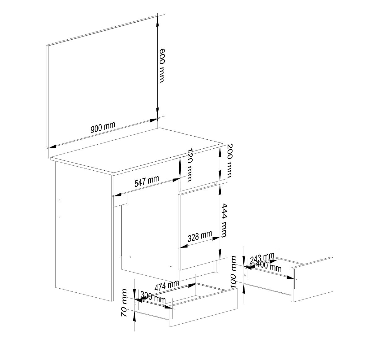 Dressing table with a mirror in a white shade featuring drawers and a spacious area behind the door.