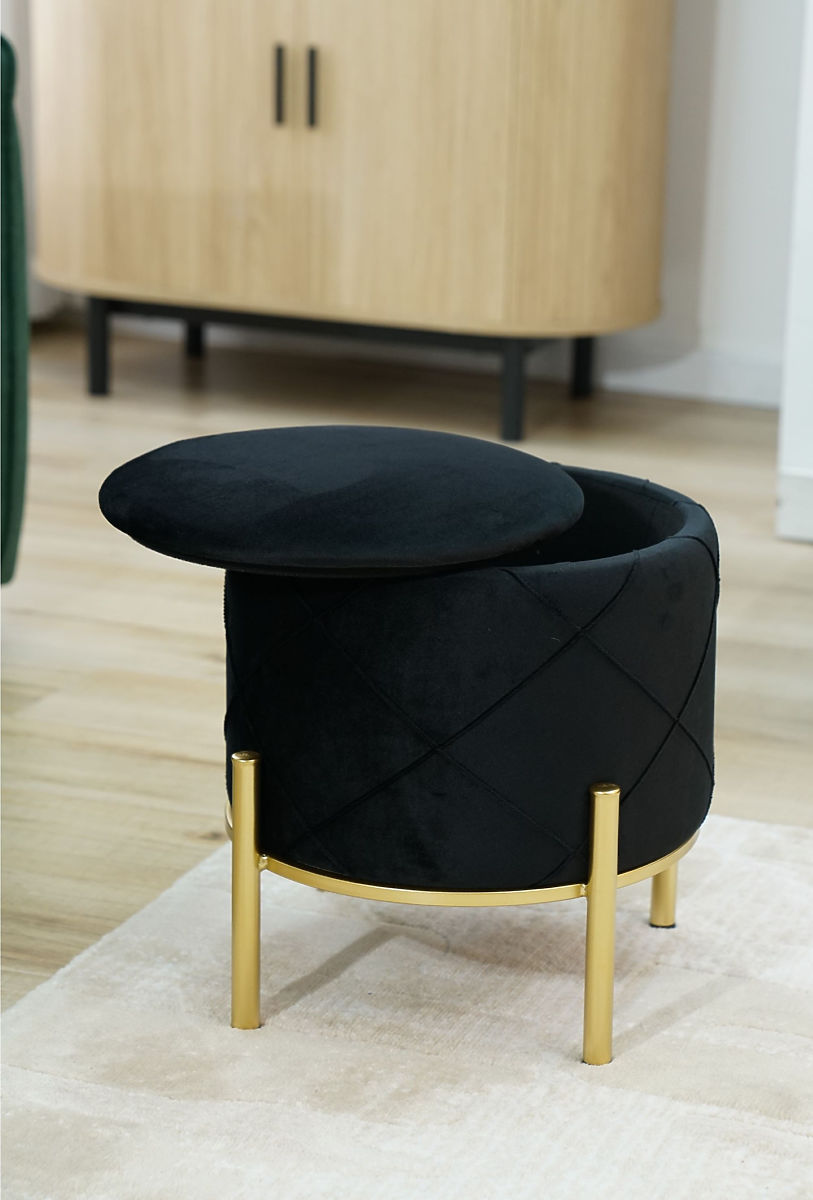The footstool or pouf is a great addition to the living room or bedroom. It allows tired feet to rest after a long day of walking, and when the pouf is made of soft velour, it enhances the pleasant feeling of relaxation. The modern look is complemented by metal legs painted in gold, which is so fashionable this year. The opening lid provides access to the storage space, where we can store items not needed for everyday use.Specifications: