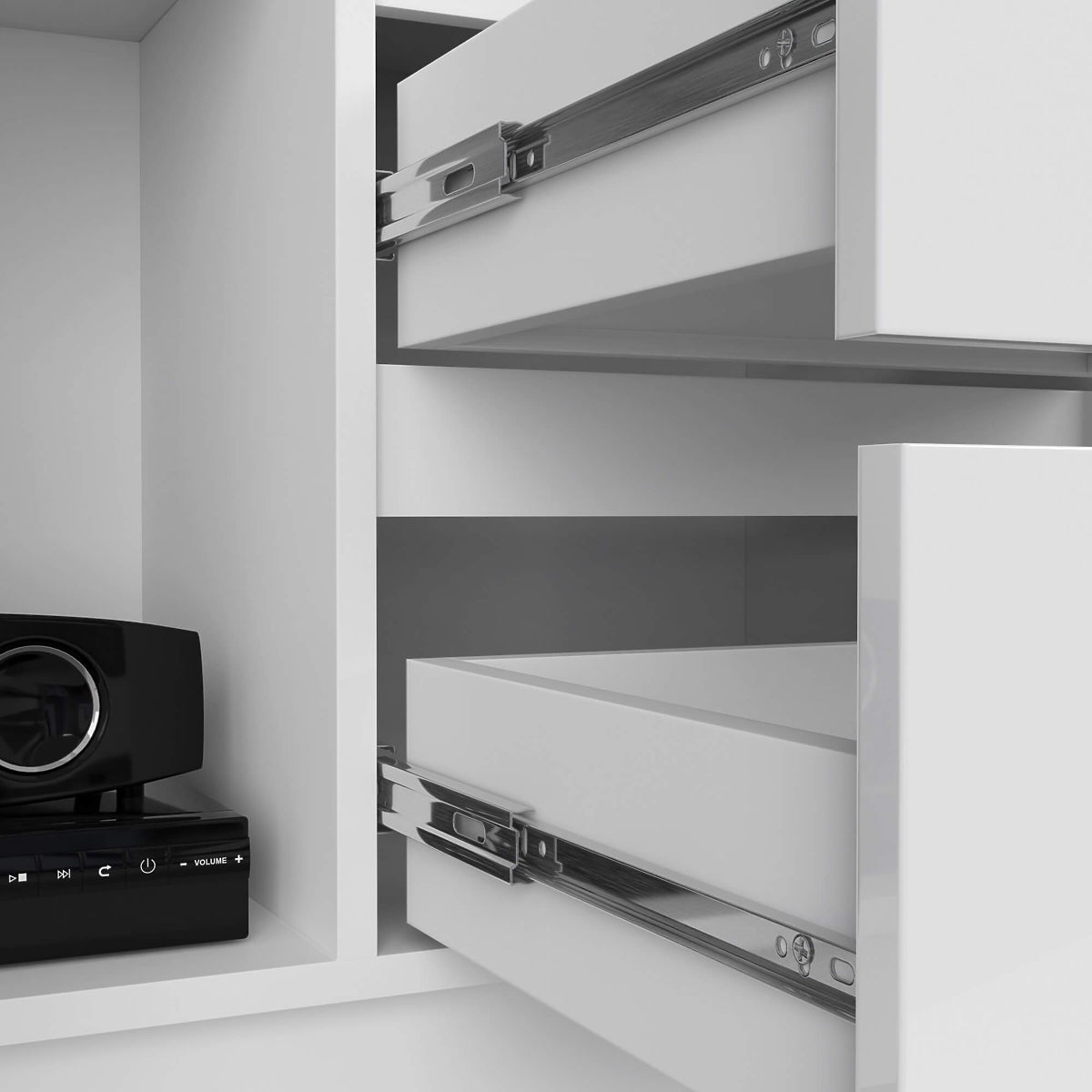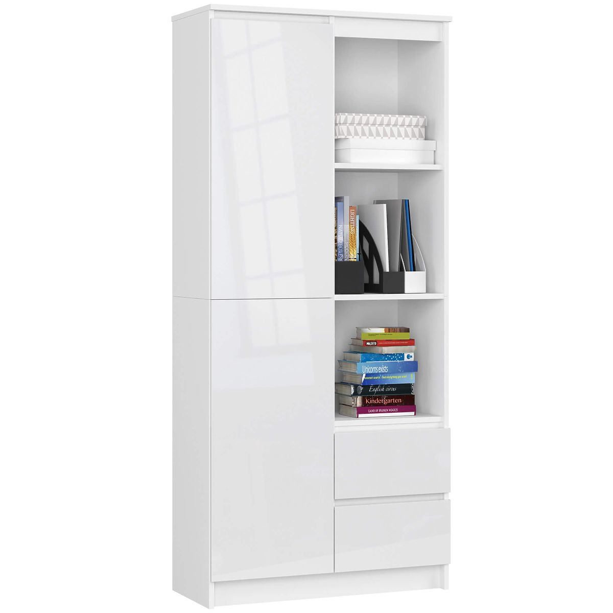Office shelf with doors and drawers in white color and front surfaces in white gloss.