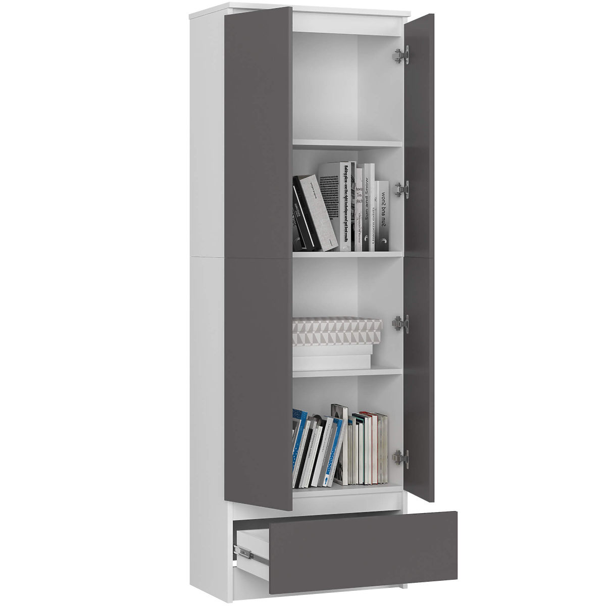 The CLP 1 office shelf features a spacious cabinet with a height of 180 cm and a width of 60 cm. The furniture has flip doors, behind which are 4 spacious shelves. These can be configured freely, as they have 3 mounting holes. An additional enhancement is a spacious drawer that moves on modern, practical ball guides. The drawer has a pull-out lock. The fronts of the furniture are made in an elegant graphite gray color, while the body is white.