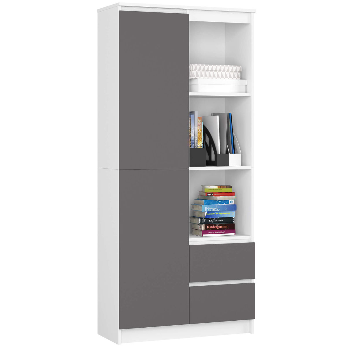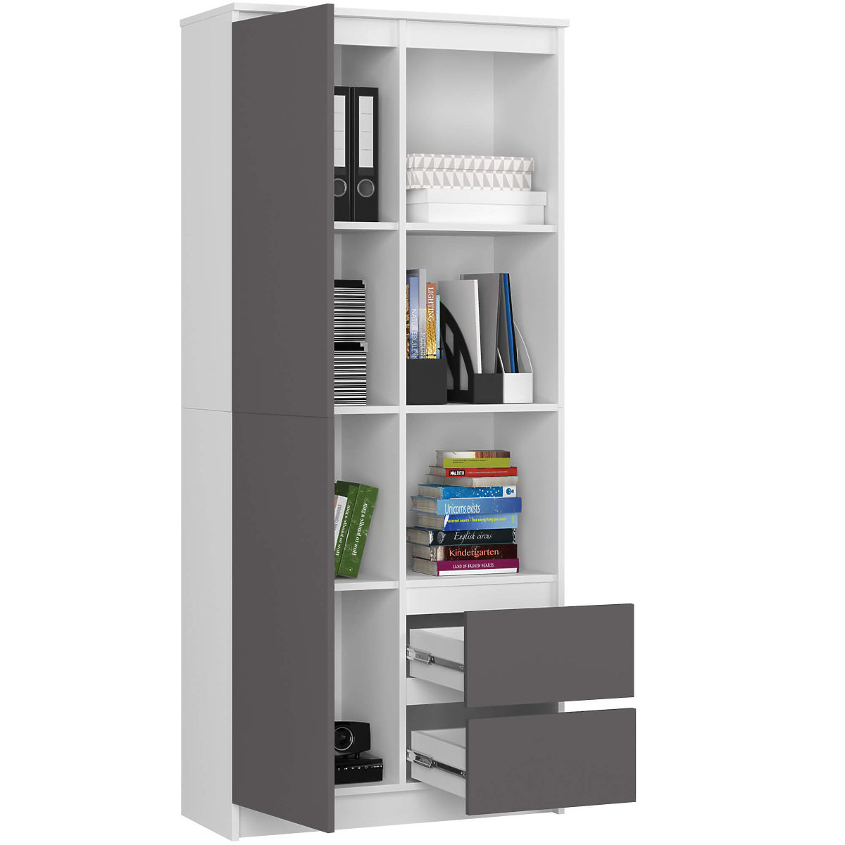 Office shelf with doors and drawers in a combination of white and graphite gray colors.