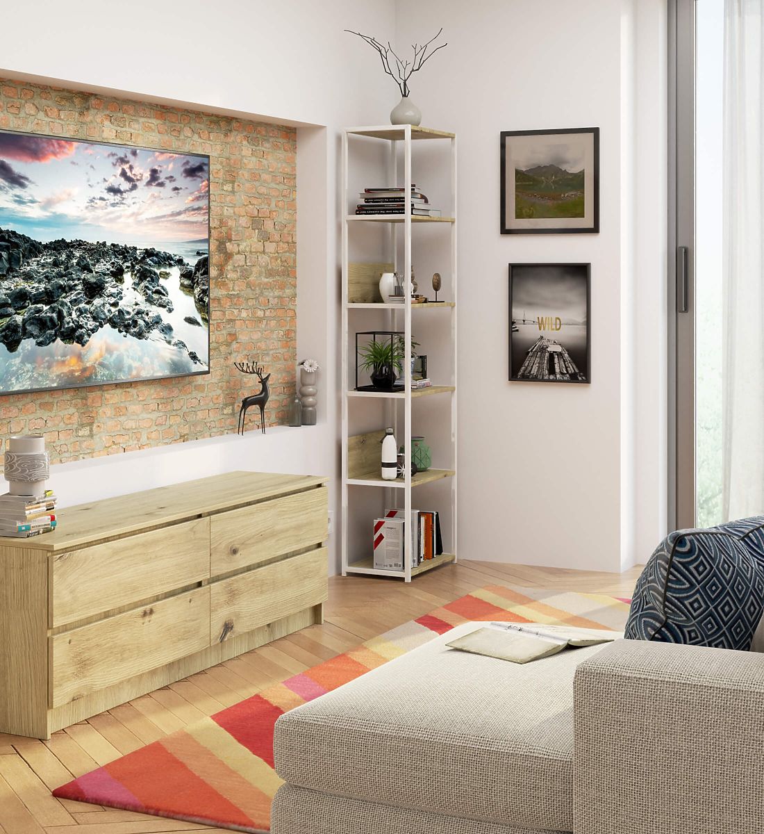 The metal loft shelf is a practical and modern piece of furniture suitable for both the living room and the office. The shelf features a white metal frame and 6 shelves in Oak Artisan color. The shelves are made from 16 mm thick laminated board, a durable and abrasion-resistant material. The edges are additionally protected with an ABS edge, ensuring the furniture remains looking good even with very intensive daily use. The shelf is equipped with 6 shelves to place items you want to display or have easily accessible. Overall, it has a very stylish and modern appearance.