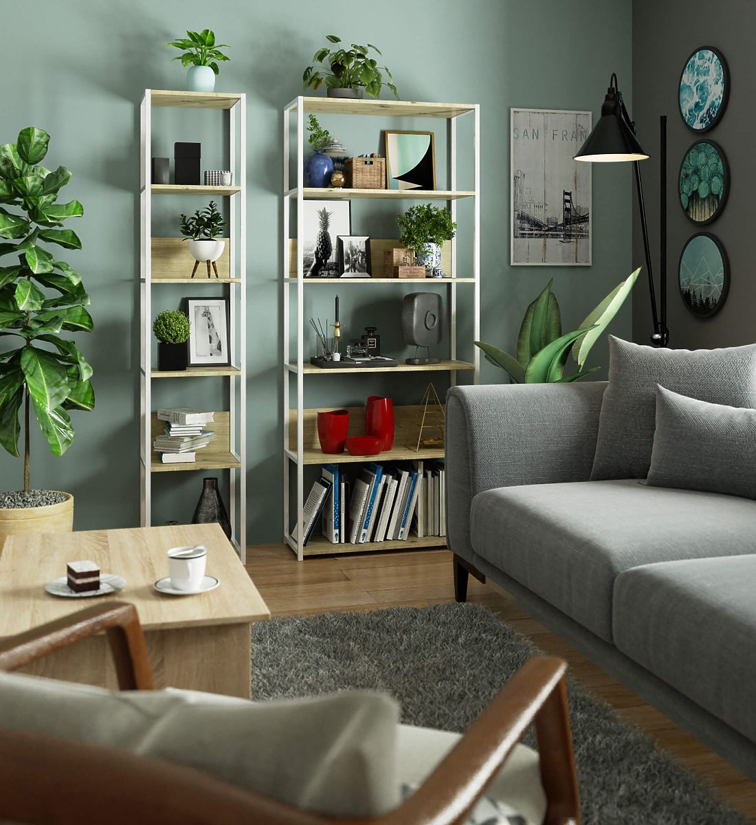 - Elegant appearance: characterized by a simple form, with a white frame and oak artisan shelves,
