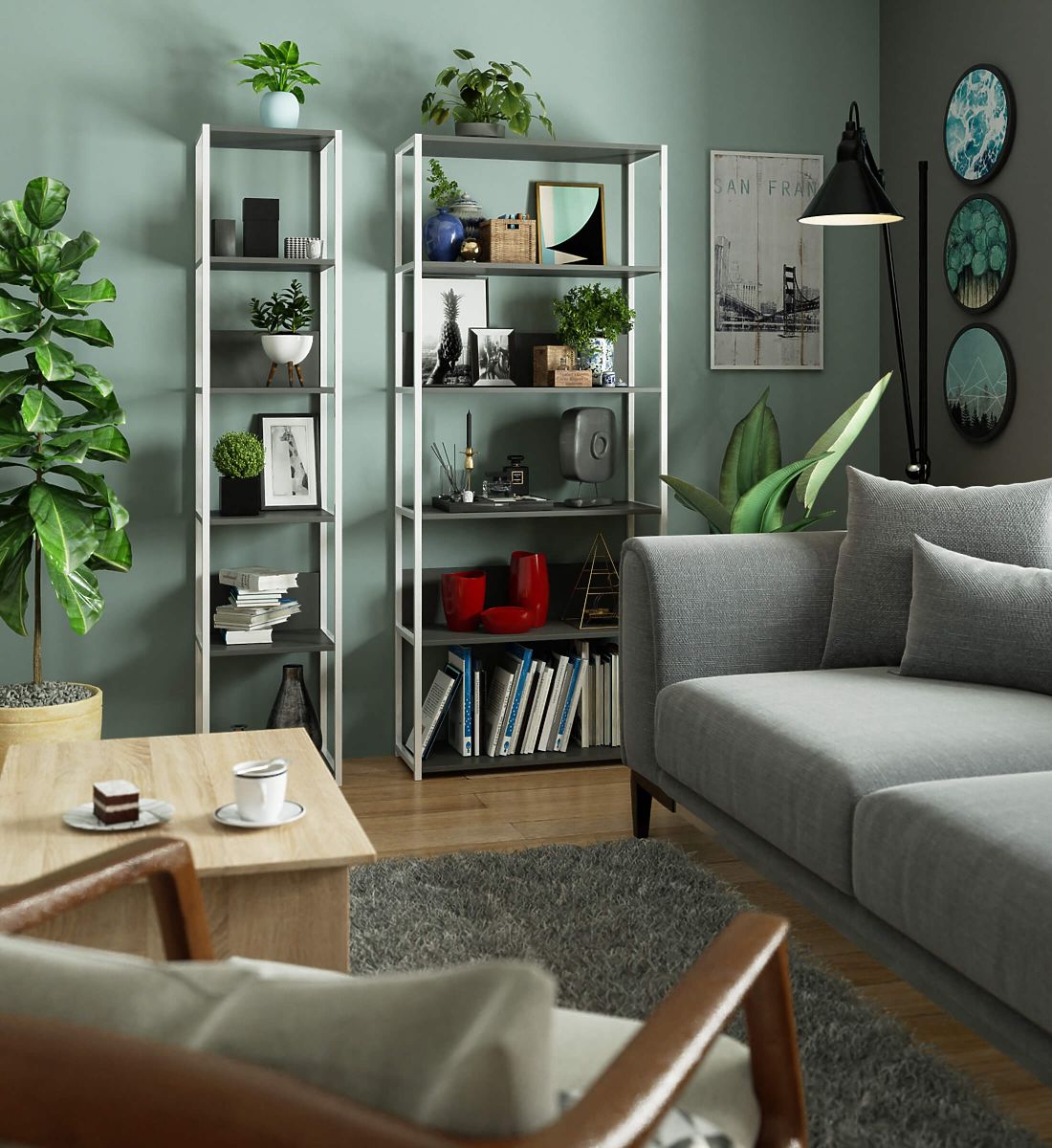- Elegant appearance: characterized by a simple form, with a white frame and grey shelves,