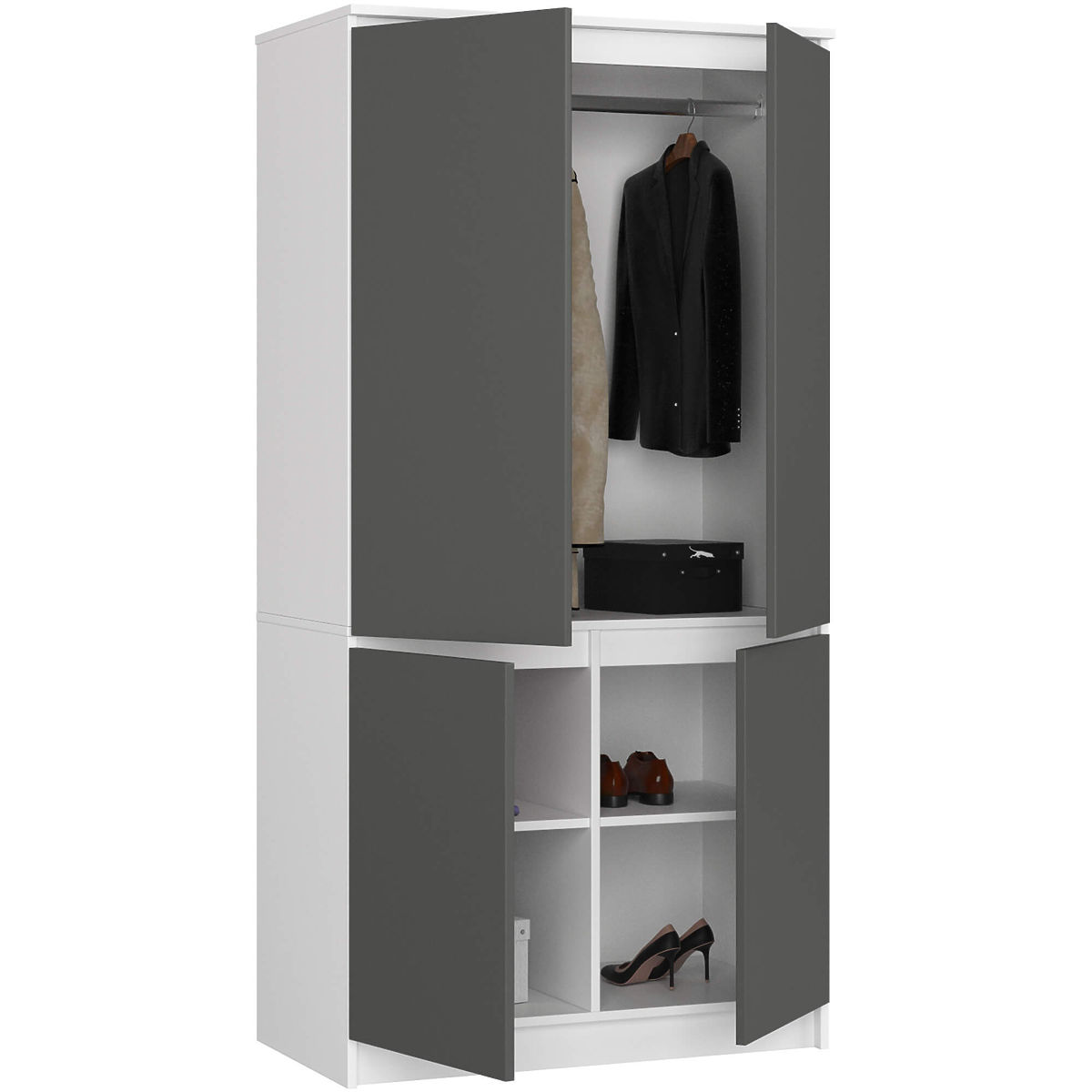 The four-door wardrobe is a versatile and practical piece of furniture that perfectly complements the furnishings of a bedroom, hallway, or living room in studio interiors. Its elegant design and white graphite gray color make it ideally suited for both classic and modern arrangements. The wardrobe is equipped with spacious shelves, perfect for storing clothing items or spare duvet and pillow covers, sheets, tablecloths, or blankets. Behind the hinged doors, there is a rod for hangers. The shelves can be used for sweaters, blouses, handbags, and also towels. The rod is ideal for hanging suits, dresses, skirts, and outerwear such as coats or jackets. The furniture is characterized by careful craftsmanship from the highest quality abrasion-resistant laminated board. The edges of the wardrobe are finished with aesthetic ABS edging.