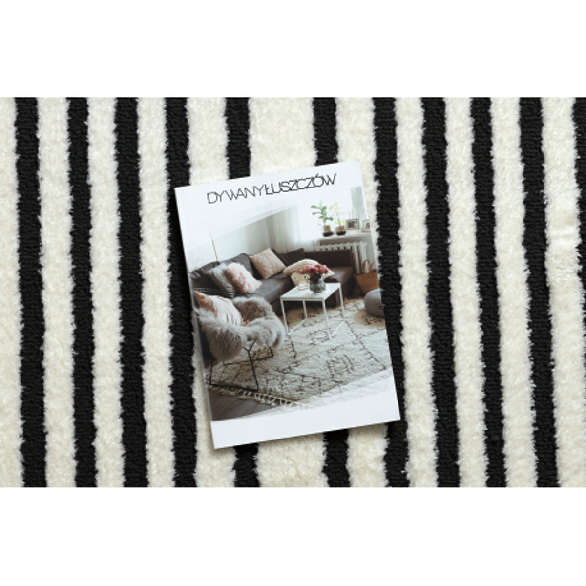 Bring a modern and stylish accent to your interior with the rectangular carpet MODE 8597 featuring a geometric pattern in a combination of cream and black colors. This designer carpet instantly revitalizes the space and adds a sophisticated, contemporary character. It is perfect for the living room, bedroom, or study, where it creates a pleasant and harmonious atmosphere. The carpet is made from 100% polyester, ensuring durability, easy maintenance, and long-lasting life. The 15 mm thickness provides a comfortable feel underfoot, while the weight of 1.8 kg/m² guarantees stability and firmness on the floor. The geometric motif in cream and black shades easily complements various furniture styles and color accessories, allowing for easy coordination with your interior.