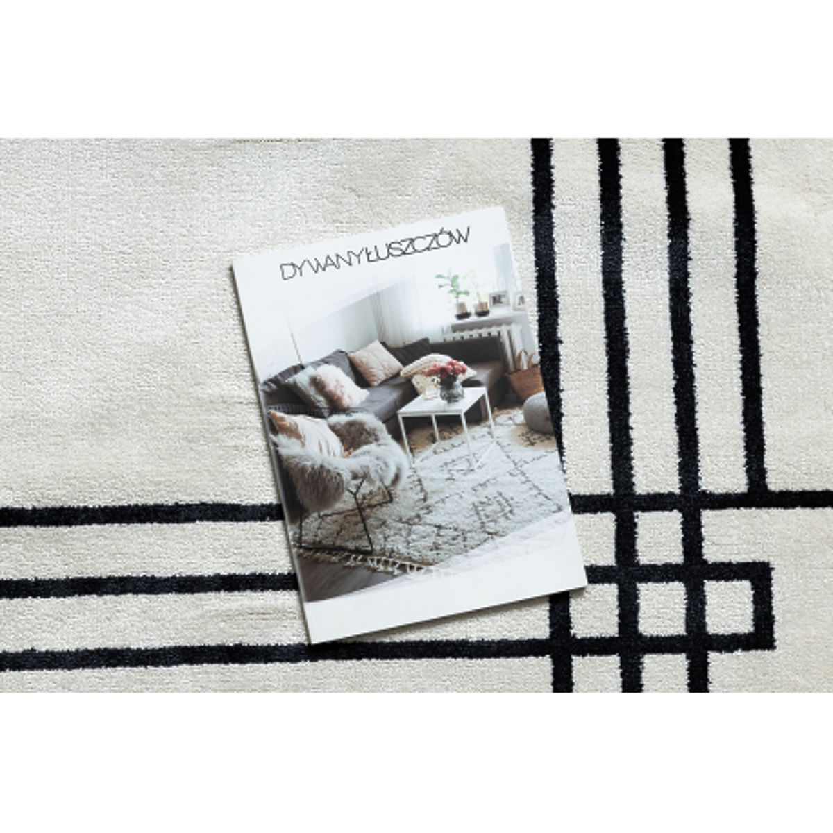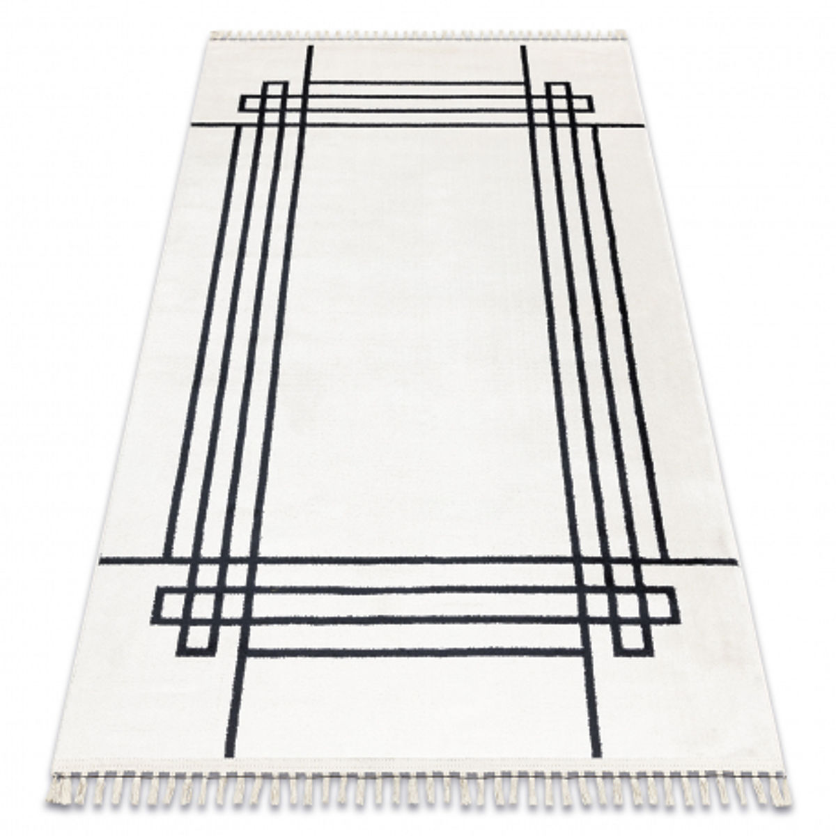 Soft cream carpet with a modern frame motif and clean lines. .. more