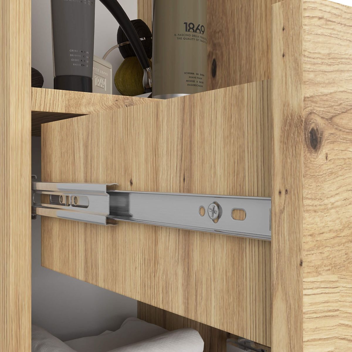 Modern bathroom column cabinet in Artisan Oak with adjustable shelves and drawer. .. more