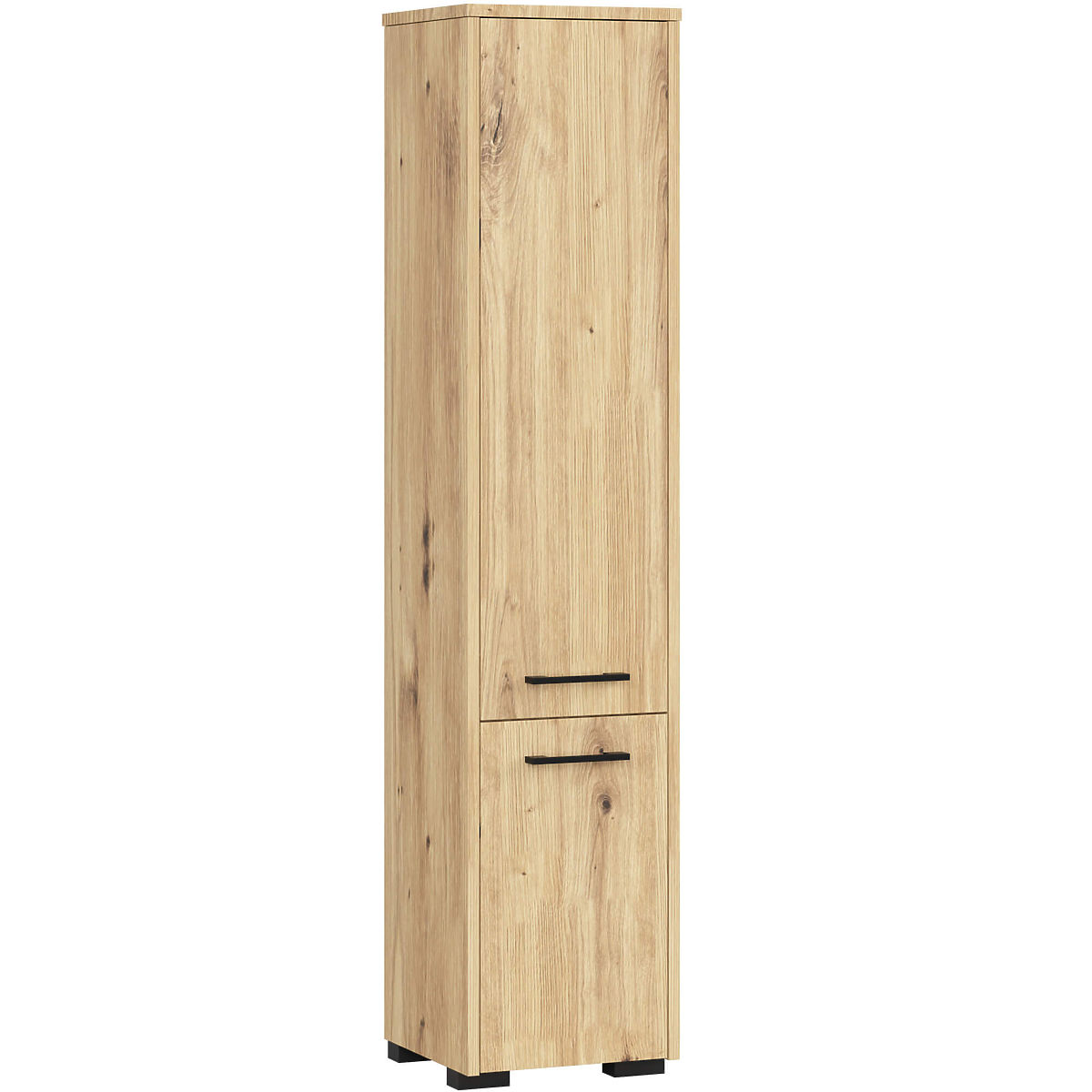 The Fin 2-door bathroom cabinet is a versatile piece of furniture that can be used in any bathroom, regardless of its size. Its elegant design and oak artisan color ensure that the cabinet perfectly matches bathrooms of any style, whether with classic or modern furnishings, and also with tiles and wall coverings in various shades. Thanks to its dimensions, the bathroom cabinet can fill often unused space in the corner of the bathroom, as well as be placed next to a sink, washing machine, or shower. The standing Fin bathroom cabinet is characterized by very careful workmanship. It has two comfortable and wide doors with ergonomic handles, providing easy access to the interior of the furniture. Deep and spacious shelves are ideal for storing towels, toiletries, cosmetics, or cleaning supplies. The bathroom cabinet is made from laminated board resistant to abrasion and water exposure. The ABS edges that finish the cabinet are durable, do not discolor, and additionally protect the cabinet from damage.
