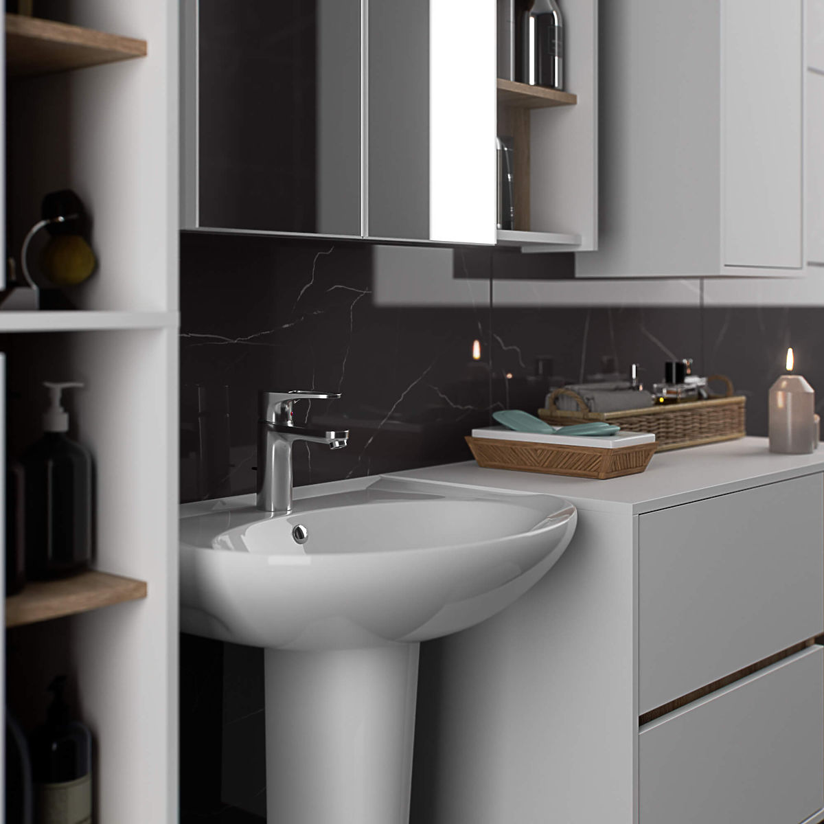 Bathroom cabinets perfectly complement bathroom furnishings, providing necessary space for all cosmetics and detergents while giving the bathroom a specific style. Spacious cabinets help maintain order in the room, which positively affects the interior's aesthetics. The VAMI collection stands out with its eye-catching stylish color scheme - the body and fronts have the same color, while the interior color is different.