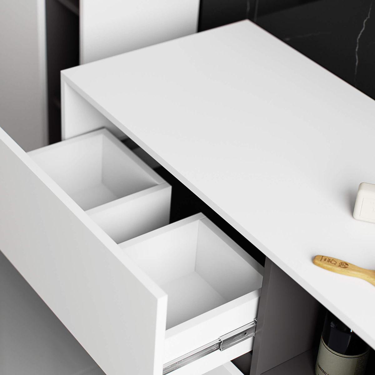 The VAMI W90 countertop sink cabinet combines modern design, light form, and high functionality. Two drawers provide convenient and aesthetic storage for toiletries and other items. An additional advantage of the cabinet is two open shelves, giving it an attractive appearance in line with the latest trends.