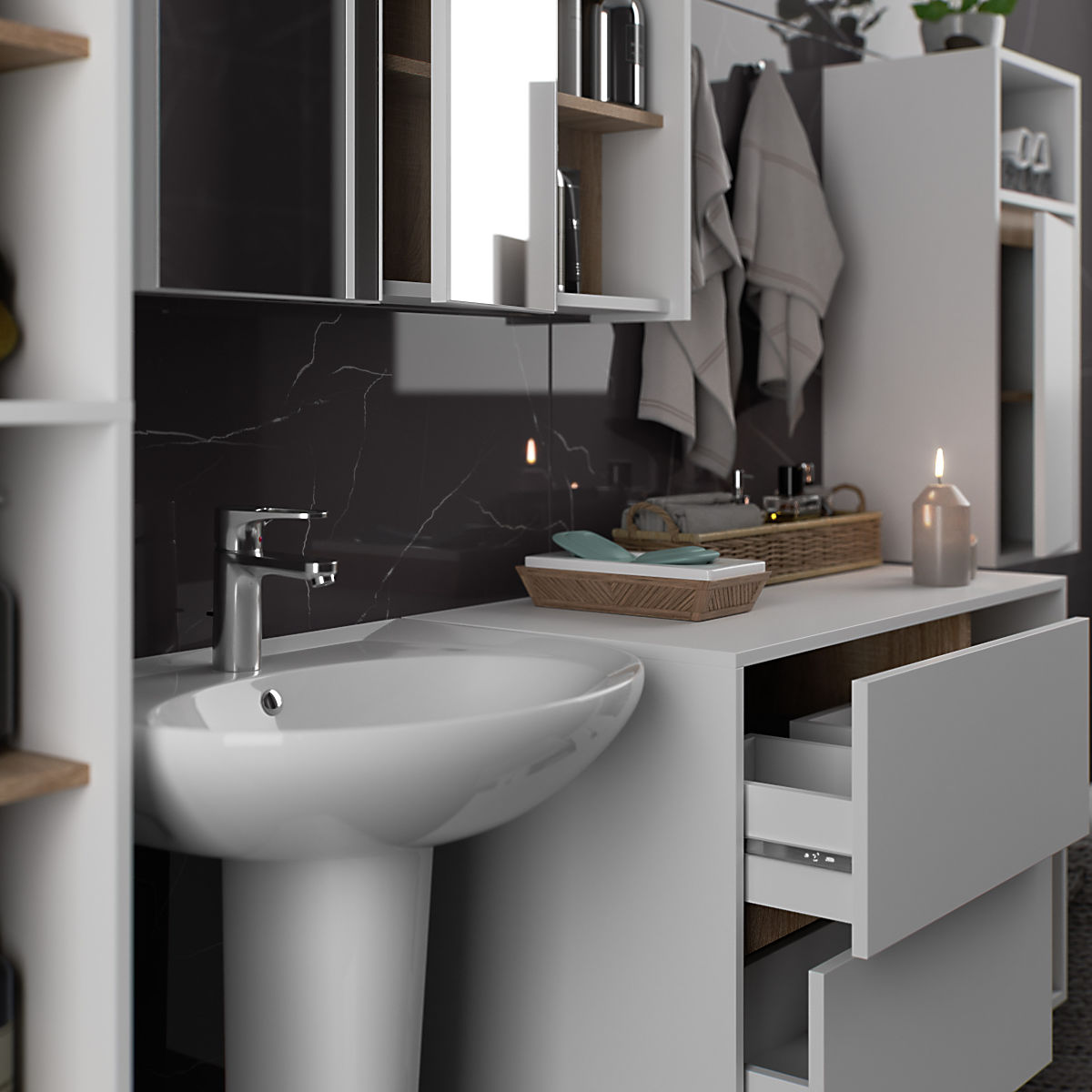 The VAMI bathroom furniture set embodies modern style. The open shelves make the cabinets visually light and perfectly align with the latest design trends. The VAMI bathroom furniture also offers ample closed space for storing cleaning supplies, bathroom accessories, and cosmetics. The set includes a hanging cabinet under the sink with a countertop, 2 drawers, and 2 open shelves (W90), a hanging cabinet with 1 open shelf W35, a tall hanging cabinet W50 with 6 open shelves, and a hanging cabinet with a mirror and 3 open shelves W90. The entire set is color and style consistent, ensuring a harmonious appearance. The cabinet under the sink has shaped drawers allowing for the installation of a siphon and hydraulic elements. The set includes: