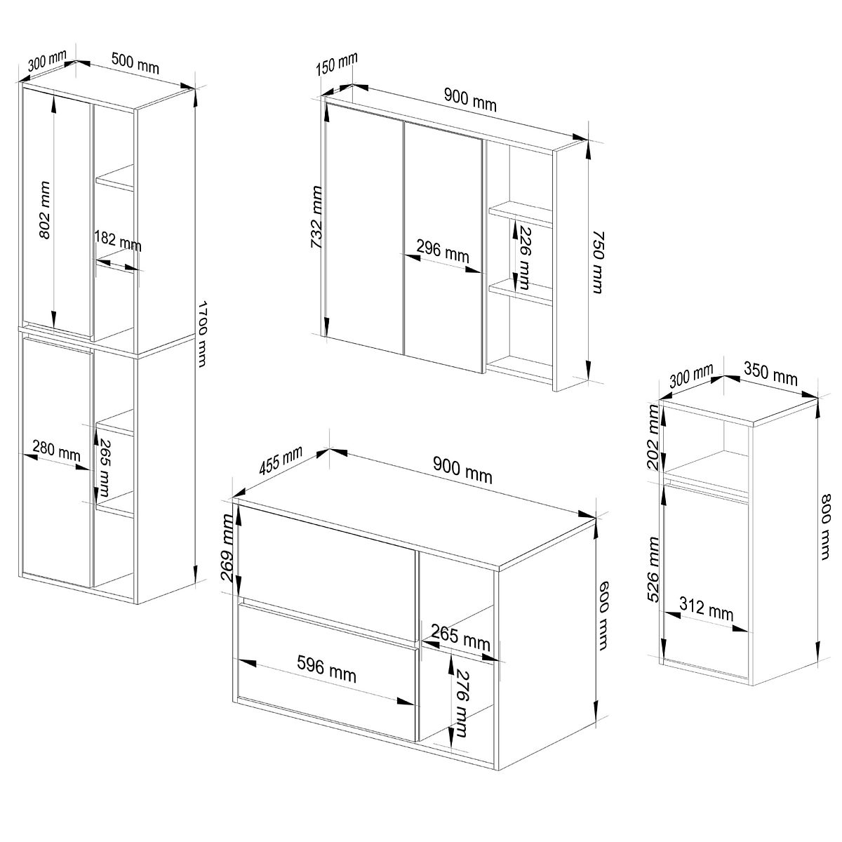 The cabinets are independent, so they can be placed in any configuration and spacing according to your needs. The price applies only to the bathroom cabinets, decorative elements are not included in the set.