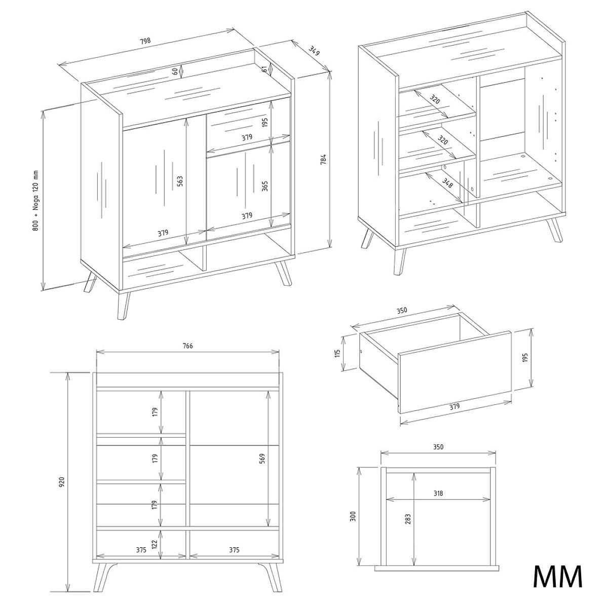 Its simple shape, handleless fronts, and high legs in Scandinavian style give the sideboard a light and modern character.