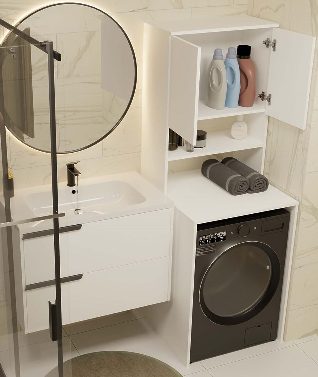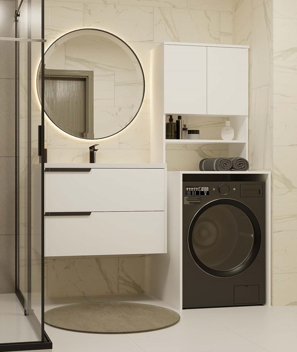 Bathroom shelf above washing machine maximizes space. .. more