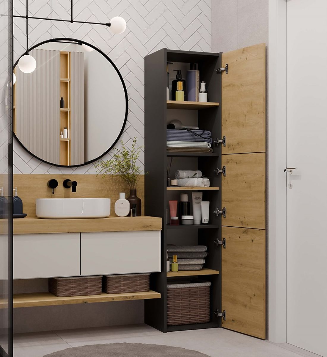 Anthracite and oak bathroom cabinet with three doors. .. more