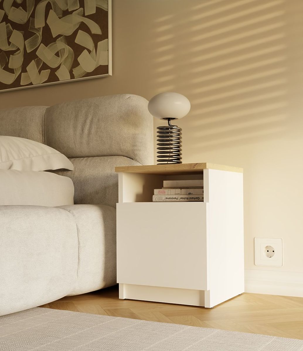 The GALAX 30 1D nightstand is a practical and aesthetic addition to any bedroom. Equipped with an open shelf and a closed space behind doors, it serves perfectly as a place for a book, phone, charger, or other items that are good to have at hand.