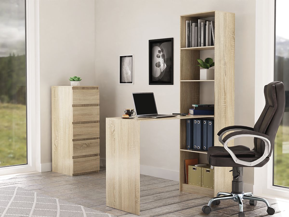 This set is perfect for both home rooms and offices. The desk can be mounted on the right or left side. By choosing the combination of a shelf with a desk, you get 4 shelves for documents, books, or other small items and a comfortable place to work.
