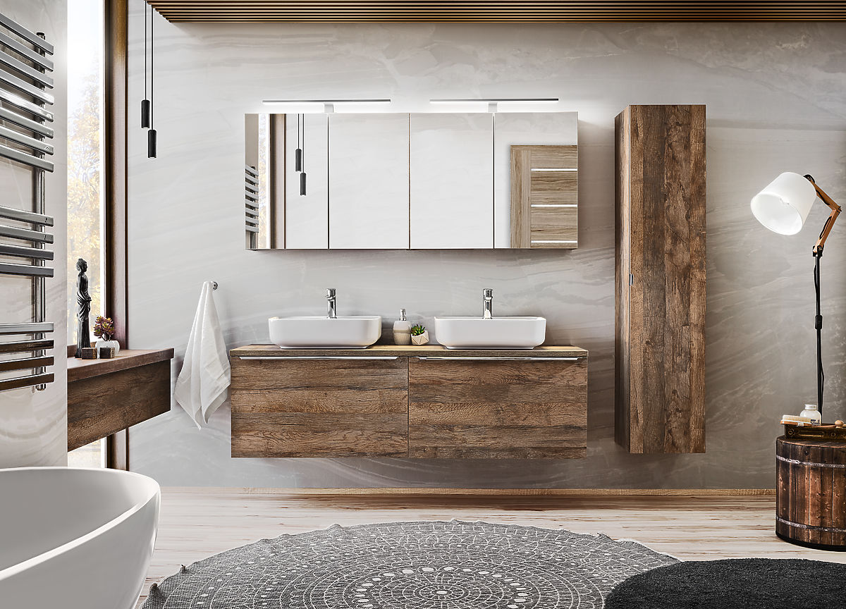 Cabinet with mirror, 80 cm wide, features 2 doors and multiple storage spaces. .. more