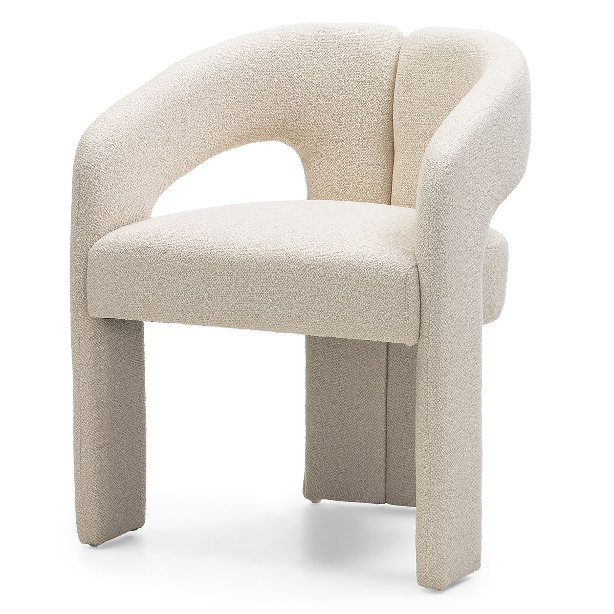 Beige upholstered chair with rounded shapes and unique arch design. .. more