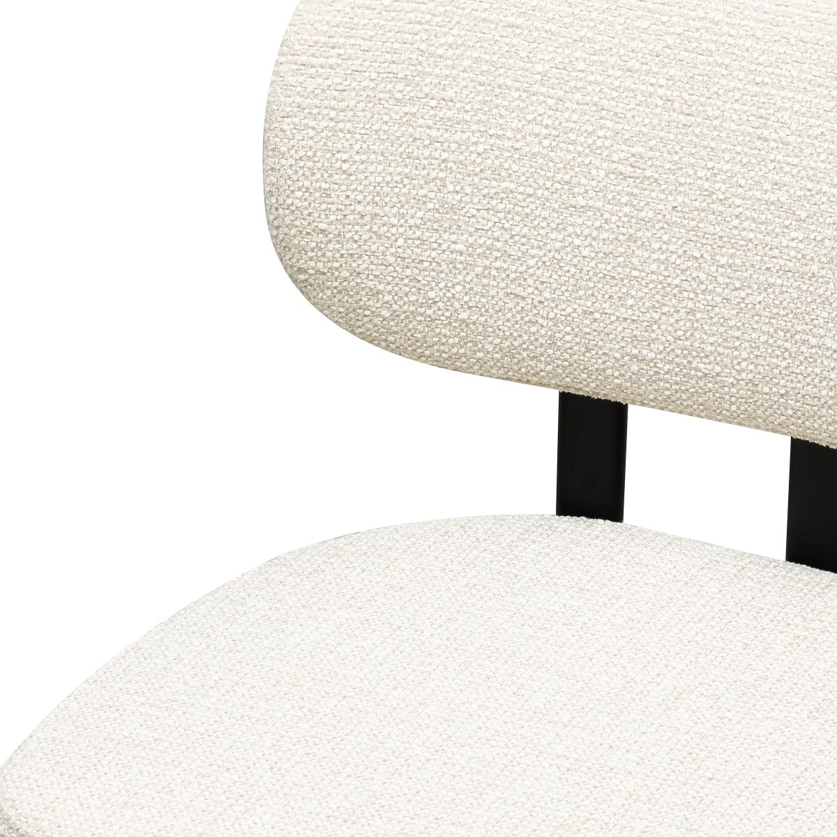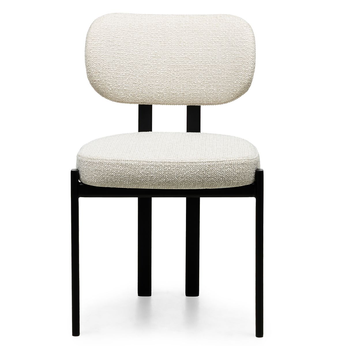 Light beige upholstered chair with black metal legs. .. more