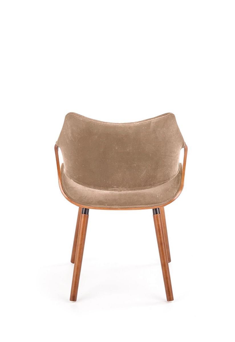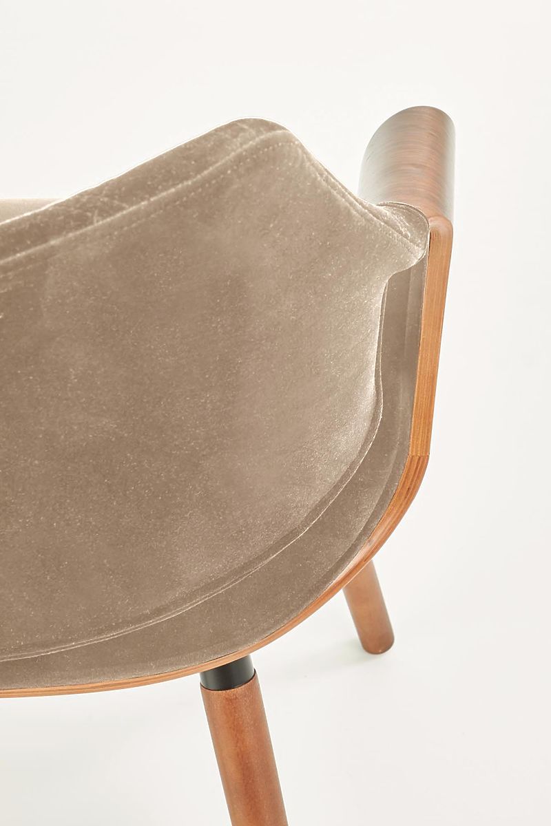 Walnut and beige chair made of plywood, fabric, and solid wood. .. more