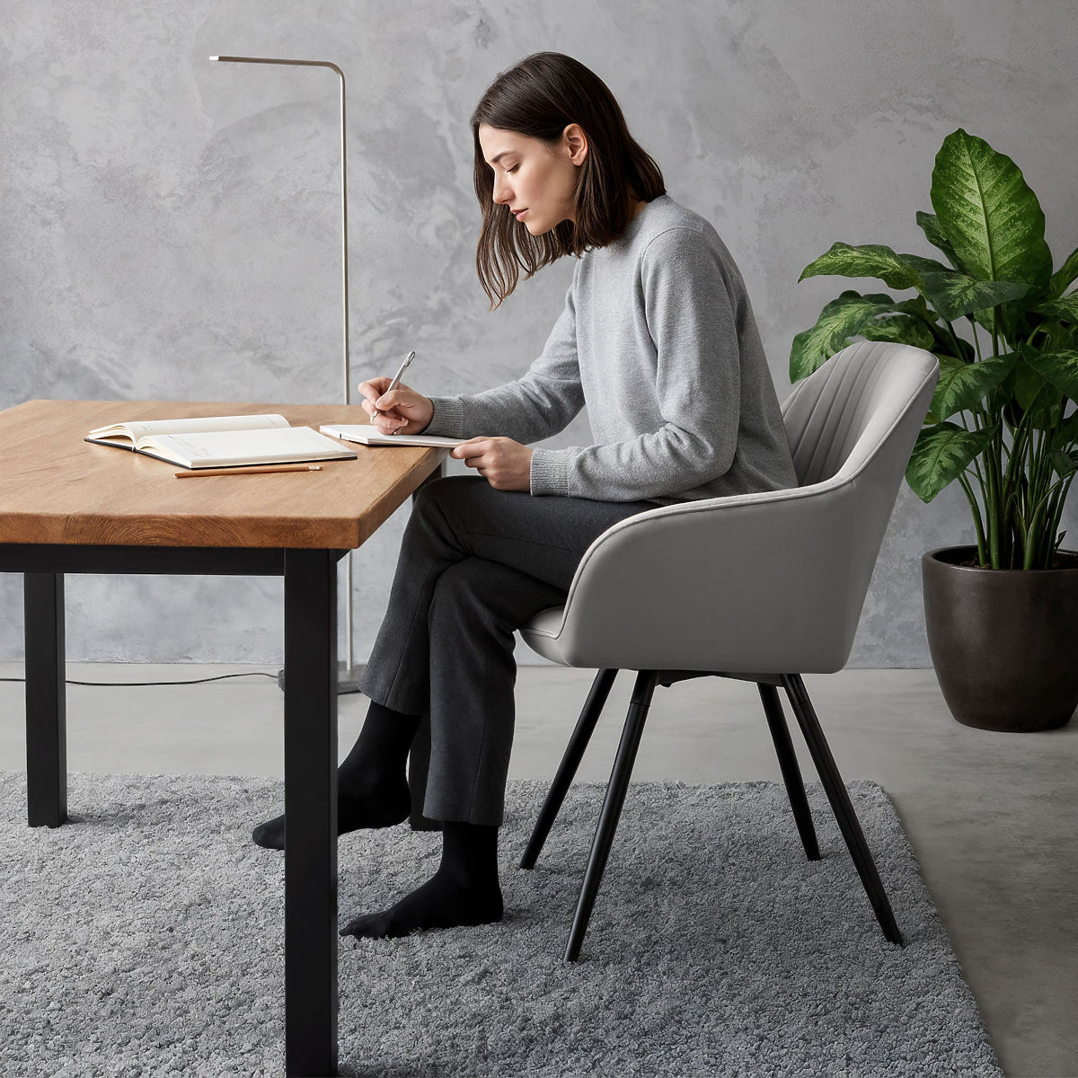 Swivel Chair TURNO is designed for lovers of modern, smart, and practical solutions. The chair rotates 360°, ensuring exceptional comfort during use. It is especially effective in small spaces - there's no need to move it away, meaning it takes up less space than a regular chair. Comfort while sitting is ensured by elegant velvet upholstery with vertical stitching and high-density foam filling. The TURNO swivel chair perfectly fits interiors in industrial, modern, or mid-century modern styles.