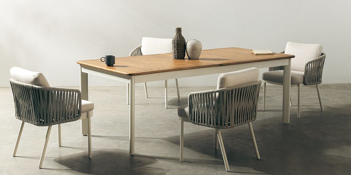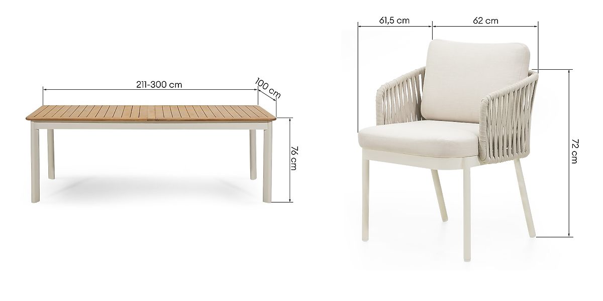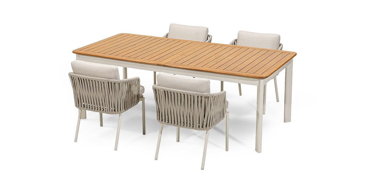The Garden Set Porticato embodies the quintessence of modern design and user comfort. It consists of an extendable table and four stylish chairs, creating a functional and aesthetic space for outdoor relaxation. The light beige color scheme, combined with wood and metal, and carefully selected details ensure that the set perfectly complements both garden greenery and modern terraces. Both the Porticato table and chairs feature a lightweight yet sturdy construction made of aluminum powder-coated in light beige. This solution guarantees resistance to corrosion and mechanical damage. The extendable table top, made from durable acacia wood with a teak finish, allows you to freely adjust its length according to the number of guests and the occasion. An additional advantage is the FSC® certification, confirming the wood's origin from responsibly managed sources. The chairs captivate with exceptional comfort – thanks to woven backrests made of durable rope and soft cushions made of hydrophobic fabric. It's the perfect place to relax with a cup of coffee, a book, or during long conversations with loved ones. Furniture made from natural wood retains its characteristic features, so all irregularities, abrasions, scratches, knots, cracks, gaps, holes, indentations, uneven edges, varied patterns, color differences, and other irregularities in the structure are intentionally preserved during the manufacturing process. These features emphasize the authenticity of the material, giving each of our products a unique character, which may lead to differences in appearance compared to the presented photos. To maintain the set's perfect condition for a long time, it is recommended to store it in a dry and ventilated place under a shelter during the winter months, ensuring protection from weather conditions.